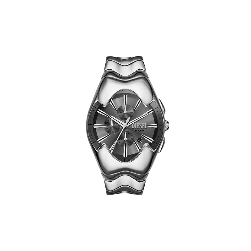 Diesel's 45mm Mercurial watch features a gray sunray dial, chronograph movement, and a polished silver stainless steel bracelet.