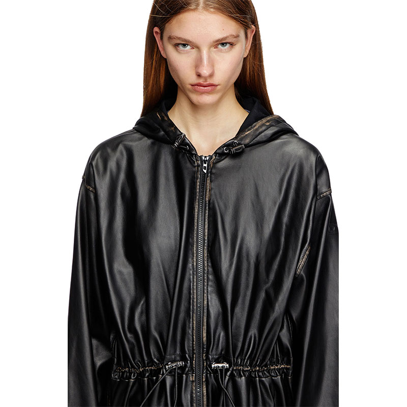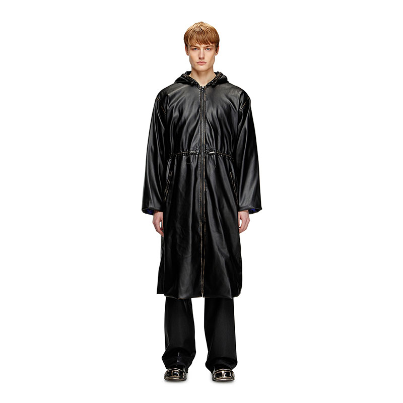 This oversized coat is a genderless piece that fuses utility with unexpected materials. Made from sleek and pliable synthetic fabric full of characterful, weather patina, it has a zip-fastening front and drawstrings to shape the hood, waist and cuffs. An embossed Oval D logo accents the sleeve.