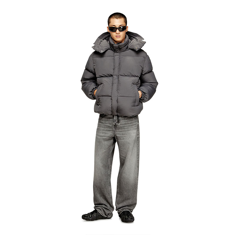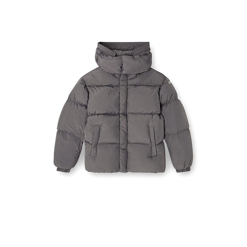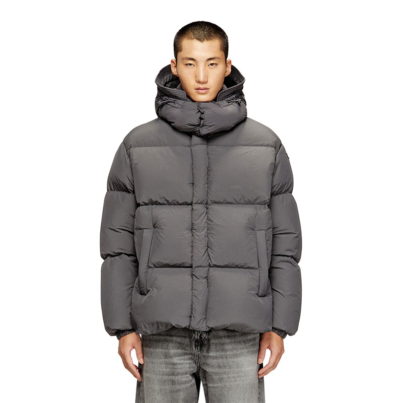 This men's regular-fit puffer jacket is built from certified recycled nylon taslan with a ViralOff finish. Ultra-lightweight design with down padding and a detachable visor-equipped hood. An embroidered Oval D patch adorns the left sleeve.