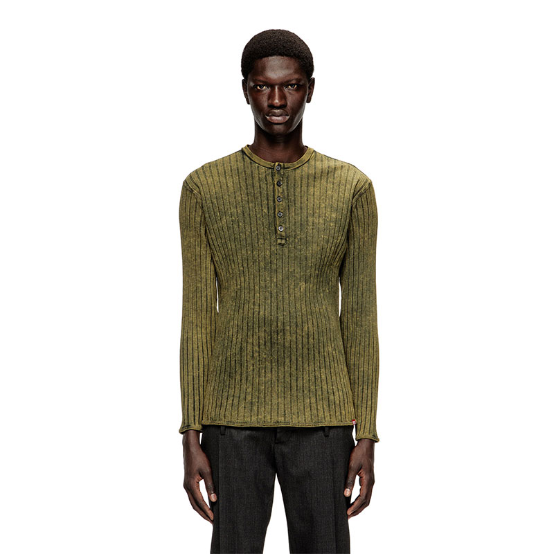 Knitted with a flat wide rib, this men's long-sleeve Henley top is part of the Fall Winter 2025 Runway Show collection. A pigment-dyed treatment gives it an uneven colouring for a lived-in look. Edged with a stretchy trim, the hem can be worn tucked up above the waist too.