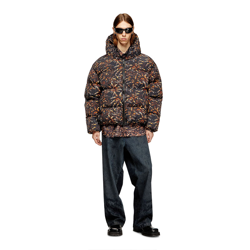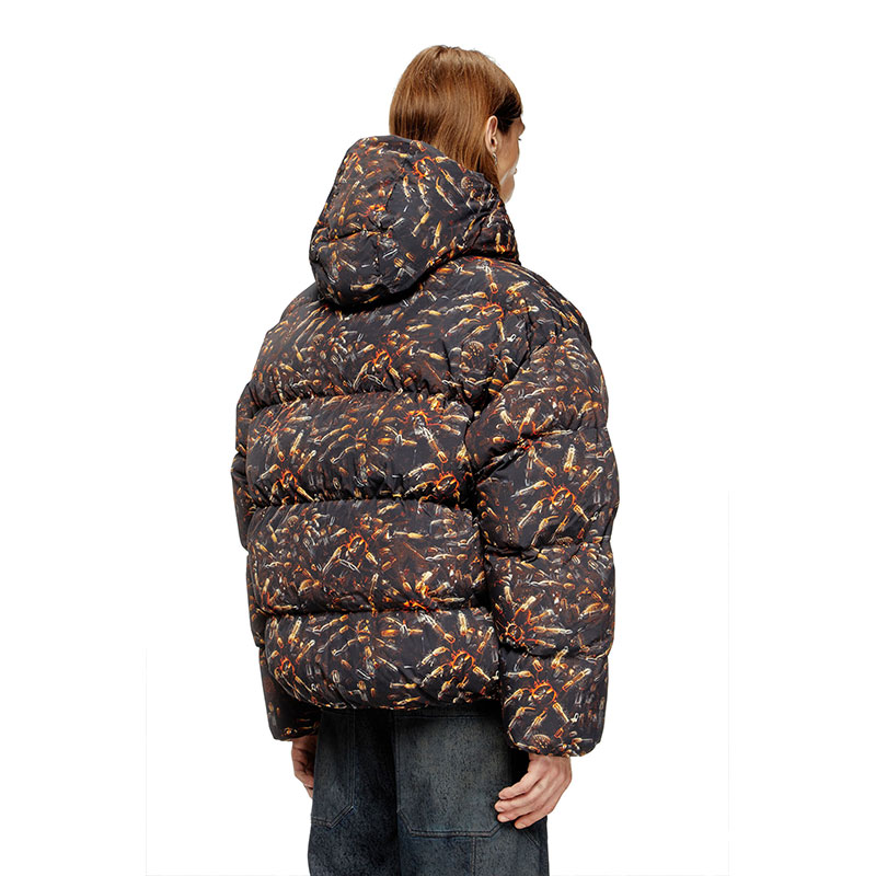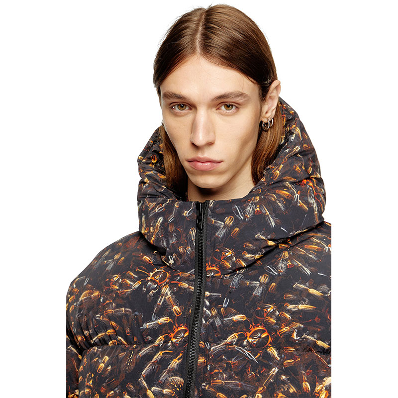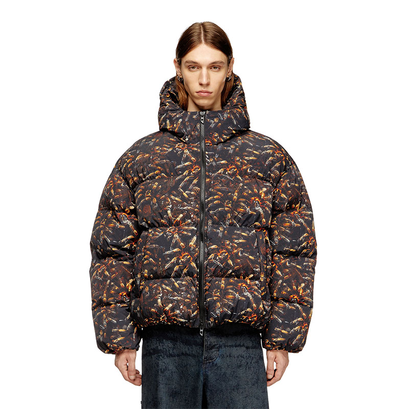 The tarantula print on this men’s quilted jacket makes you forget the creature’s solitary nature. Made from lightweight recycled nylon winterproofed with padding, it’s equipped with secure zip pockets and a cosy lining at the hood. Drawstring-adjustable cuffs and hem trap heat when the temperatures plummet.