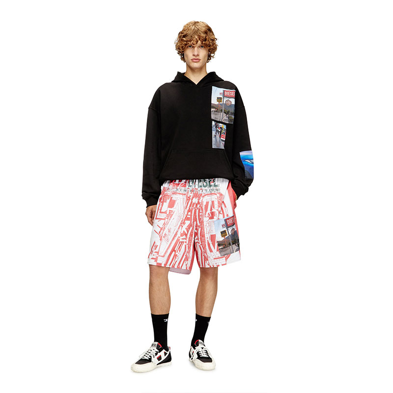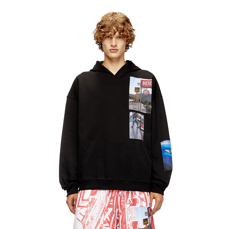 This men's hooded sweatshirt is embellished with raw-cut photographic patches that incorporate a variety of Diesel logos in the details. Its relaxed silhouette is built from organic cotton jersey.