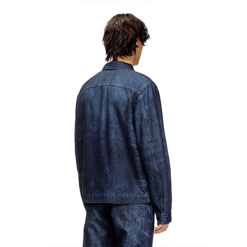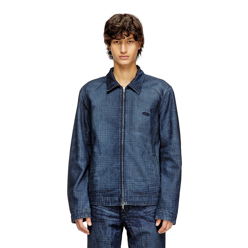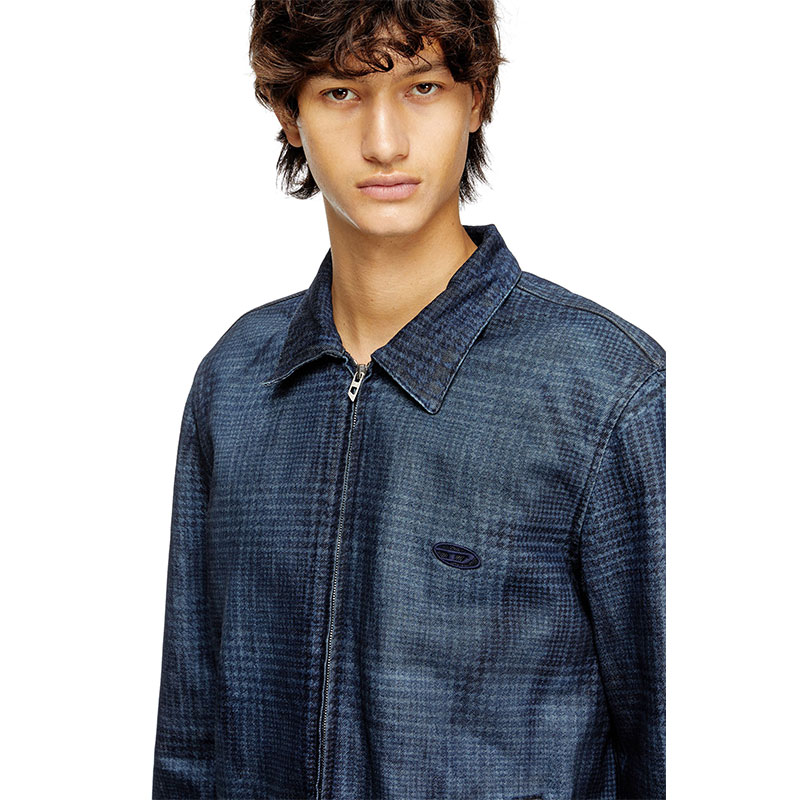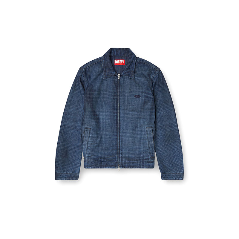 This men's zipped jacket features a minimal, sleek blouson profile, lined for smooth layering.Crafted from a combination of cotton and hemp, the fix denim nods to traditional tailoring, while keeping true to Diesel's DNA. A subtle Prince of Wales pattern is meticulously traced onto the fabric using multiple laser passes. Iconic whiskering and stonewash effects blend with the checks, while a final spray treatment enhances the deep, dark blue hue.