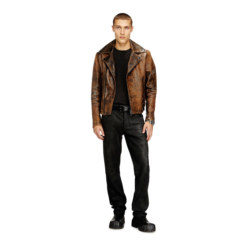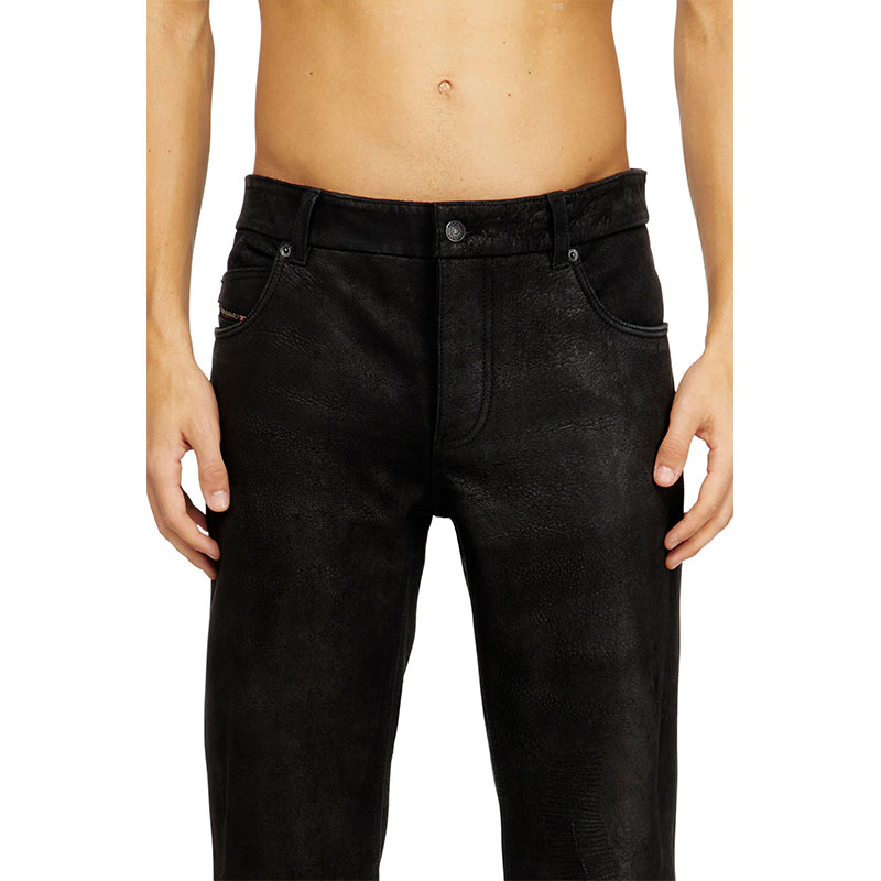 An irreverent spin on five-pocket denim, these men’s trousers carry all the hallmarks of jeans – but are crafted from leather. Responsibly sourced, the leather is washed, hand-treated and subtly distressed to create the final look. Complete with a button fly and Diesel's iconic fifth pocket logo flag.