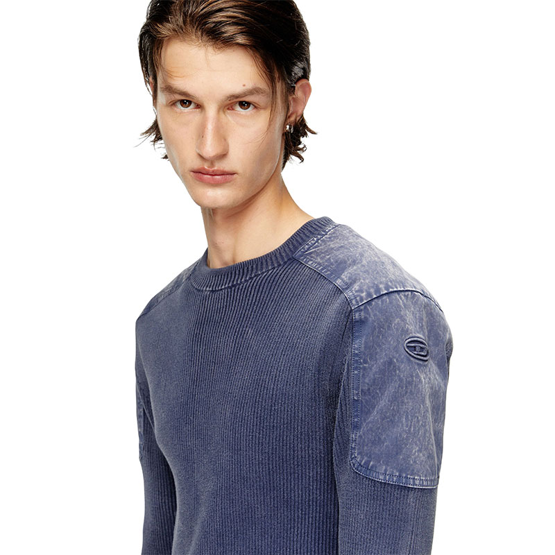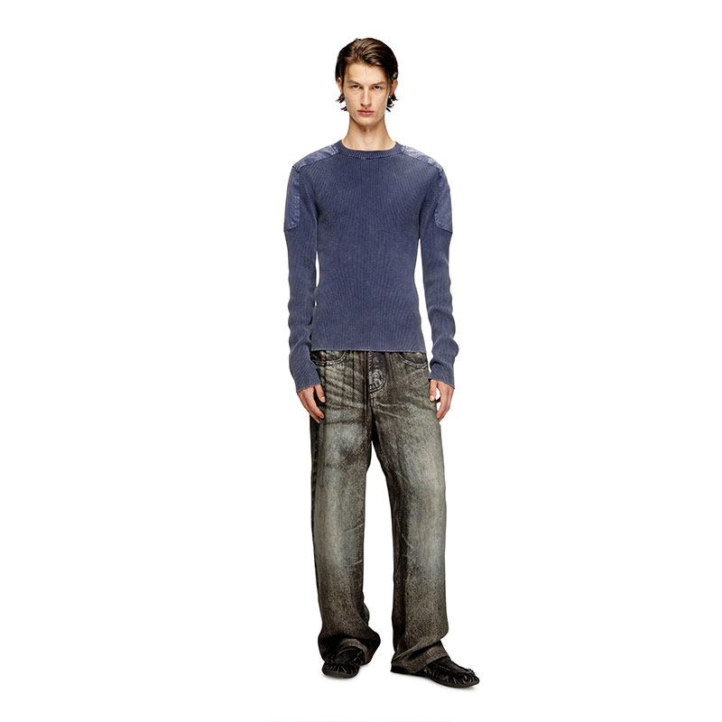 For the utilitarian city-dweller, this men’s jumper is defined by its marbled fade and contrasting treated fabric panels that frame the shoulders. It’s rib-knitted from cotton in a close-fitting silhouette and hallmarked with an embroidered Oval D on the sleeve.