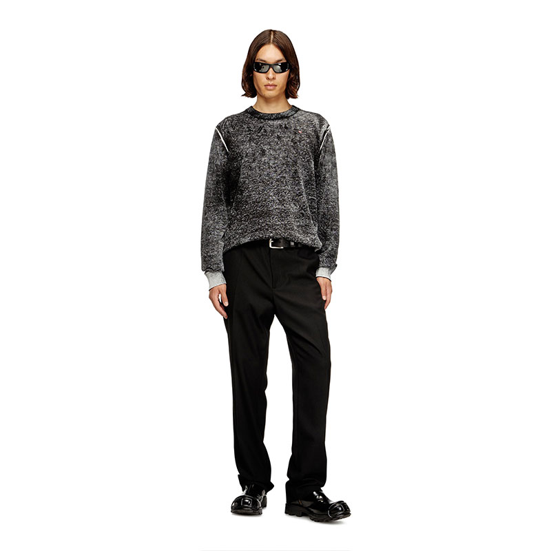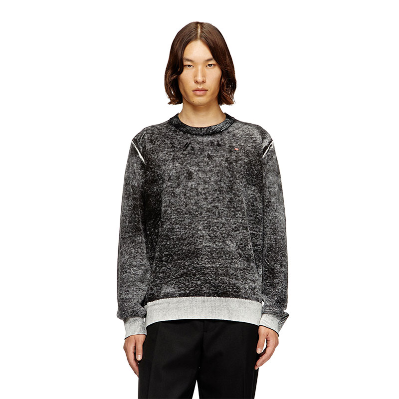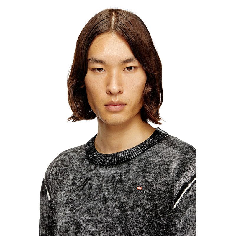 This men's cotton sweater is cut for a regular fit and features a micro-sized Diesel logo embroidered on the chest. The colour – moody and worn away, with decidedly lighter areas – bleeds from a print applied on the inside of the knit, serving raw DIY energy and grit.