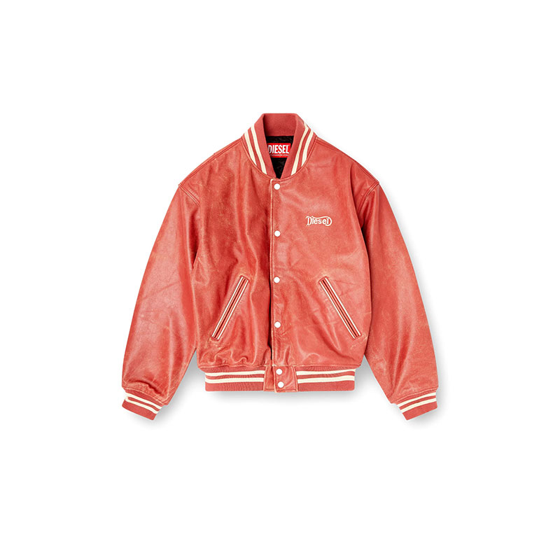 Unisex bomber jacket made from cow leather featuring a treated solid finish, striped ribbed collar, cuffs and hem. It features snap button closure and welt pockets on the front. The logo detail on the chest and a large Diesel logo graphic embroidered across the back, delivering a bold and iconic accent to the design.