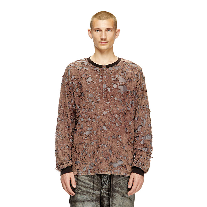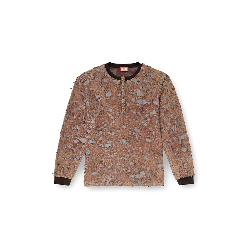 This men's long-sleeve T-shirt combines brown cotton on the outside and shiny grey fabric on the inside: the outer yarn is burnt away to create a striking peeled effect. A marble wash accentuates the lived-in look, while a button placket defined its relaxed profile.