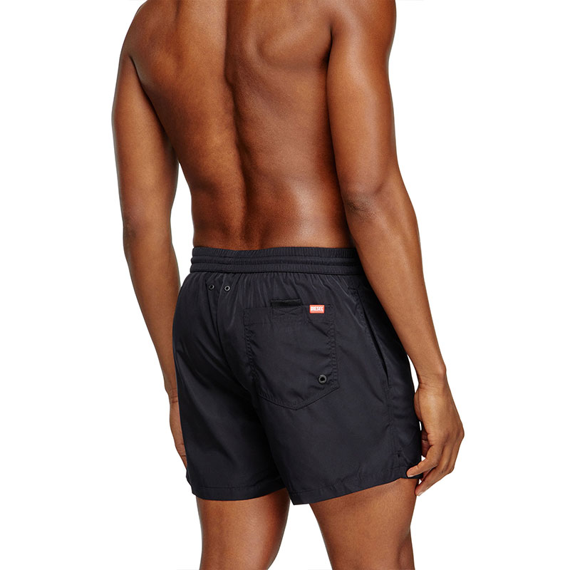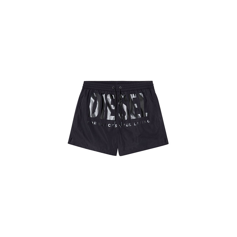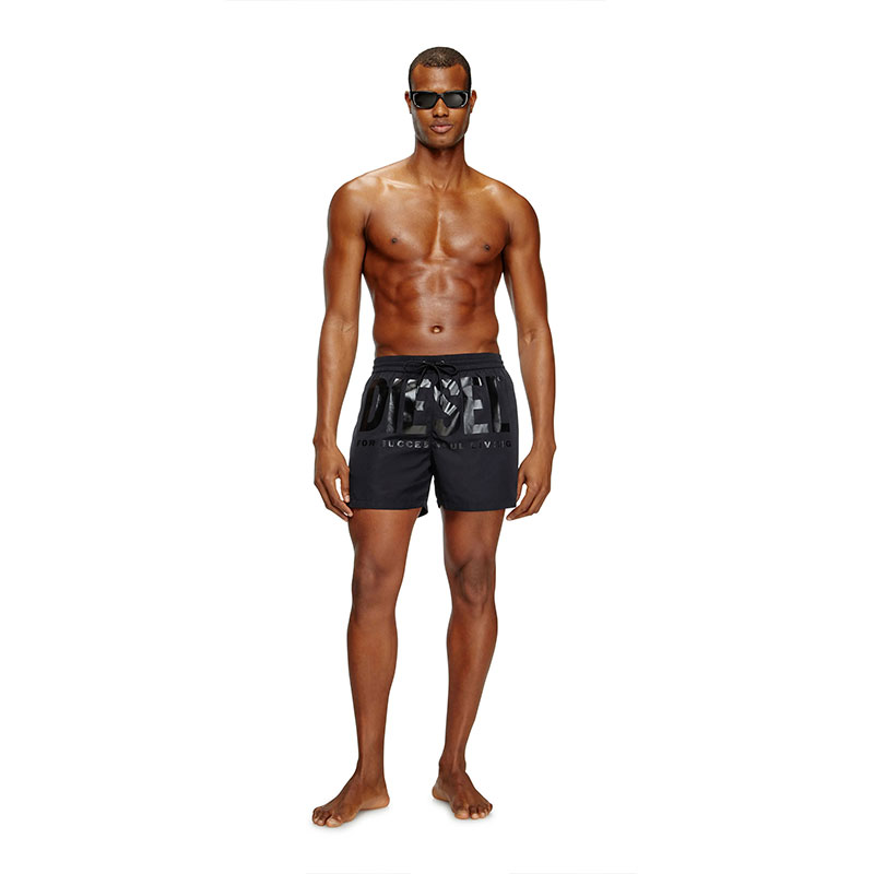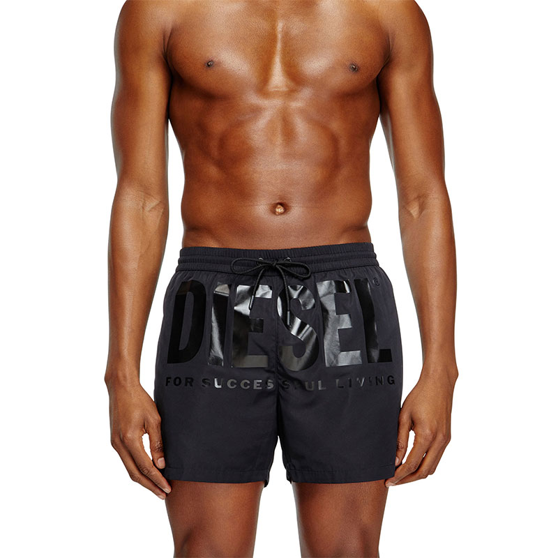 Men’s swim trunks in recycled quick-dry fabric, emblazoned across the front with a bold Diesel For Successful Living logo print. This mid-length pair has a trio of pockets and a comfortable waistband adjustable with a drawstring.
