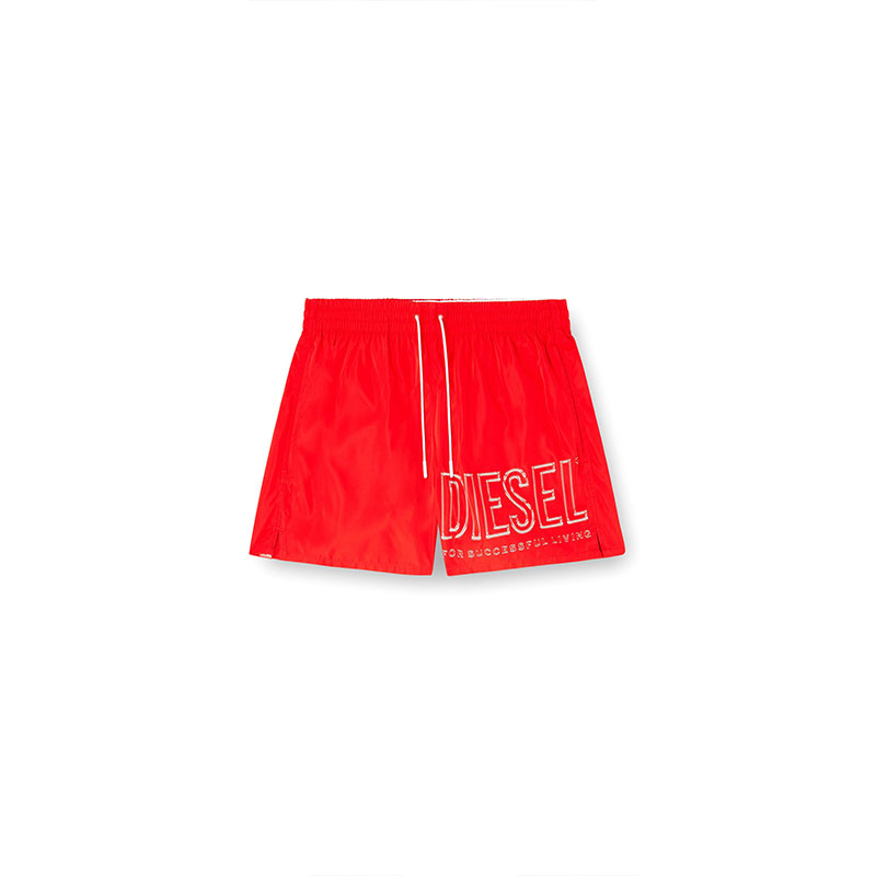 Men's swimming trunks made from recycled polyester, featuring mesh-lined pockets and an inner lining for added comfort and support. The swim shorts feature side pockets and a back patch pocket, an elasticated waistband and contrast drawstring with branded rubber ends. The Diesel logo on the front left leg is printed as an outline.