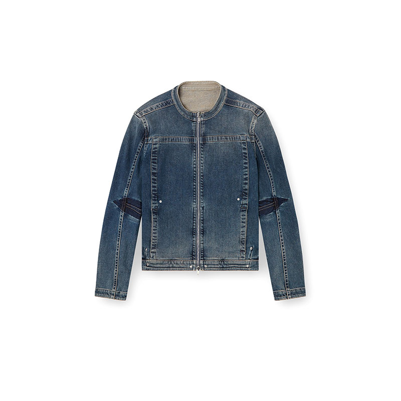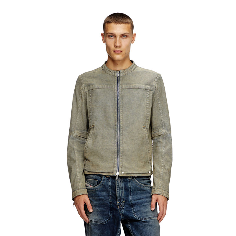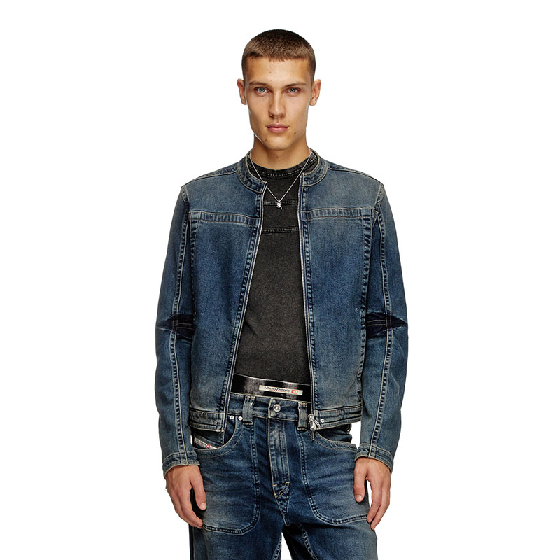 This men's denim jacket updates a heritage Diesel style. Featuring a rounded snap-button collar, metal zip closure and side pockets, it's detailed with branded rivets and bold seams that frame the sporty moto silhouette.