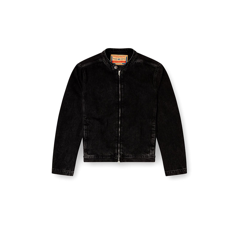 This men's denim jacket is unquestionably a Diesel wardrobe staple. The sleek silhouette nods to moto styles, featuring a rounded snap-button collar, metal zip closure, and side pockets.