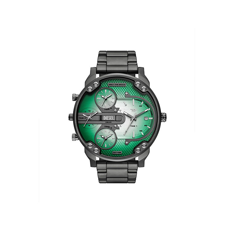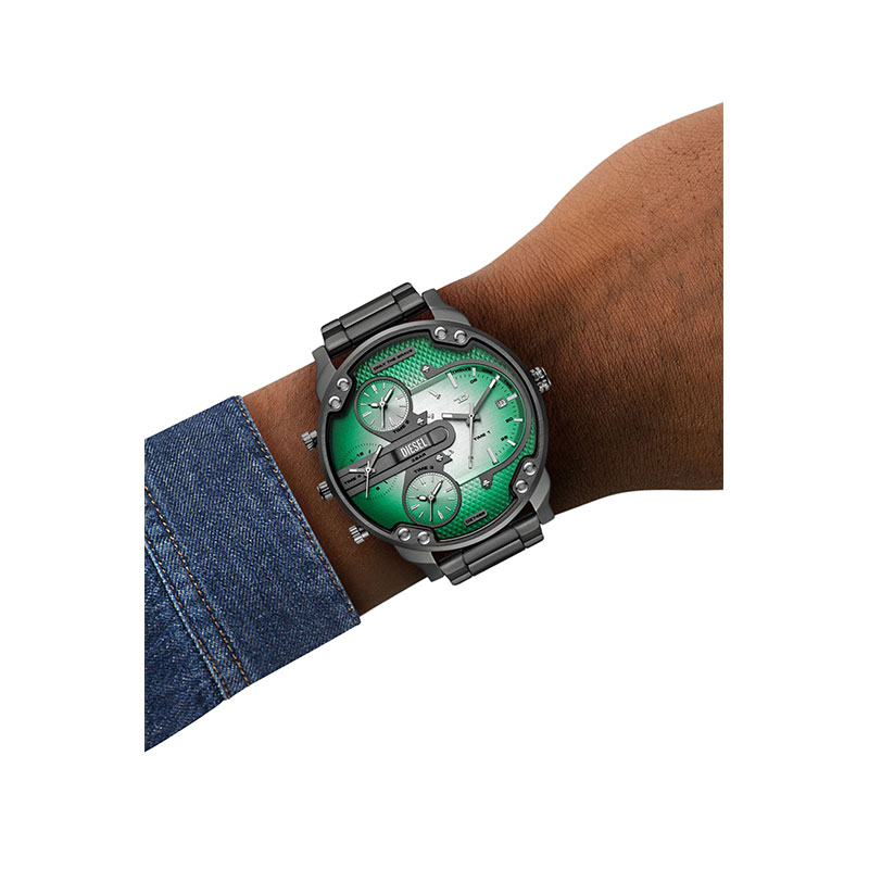 Diesel's 54mm Mr. Daddy Slim watch features a green and white dial, multi-movement and a gunmetal stainless steel bracelet.