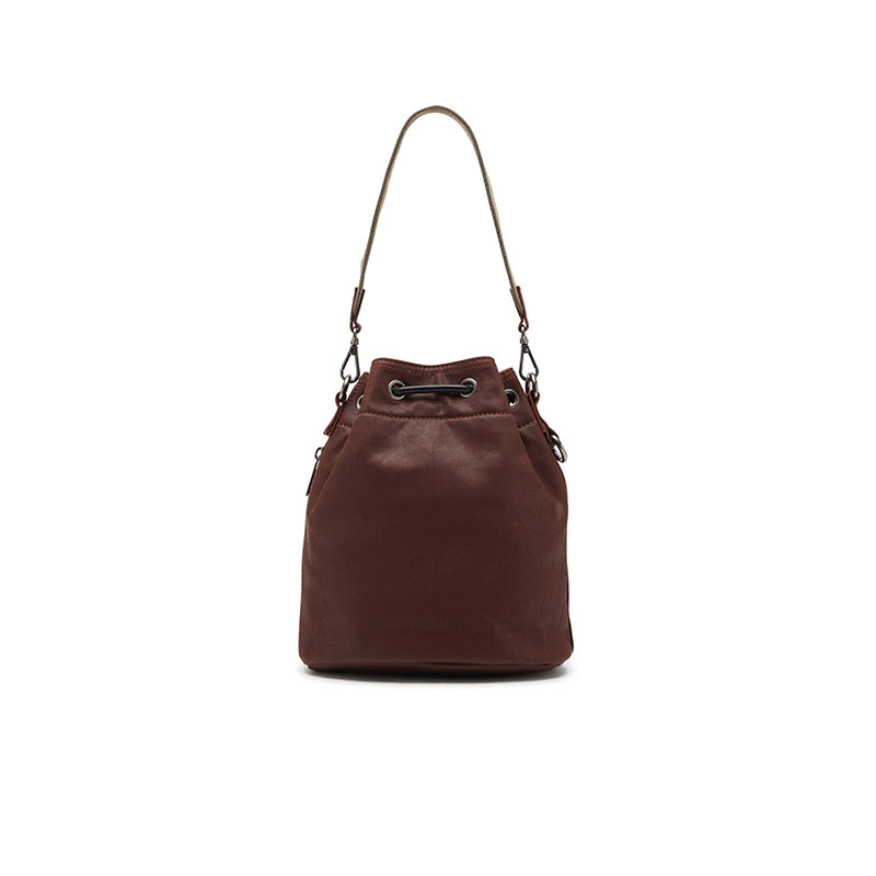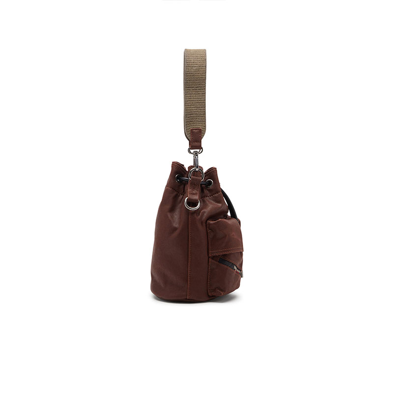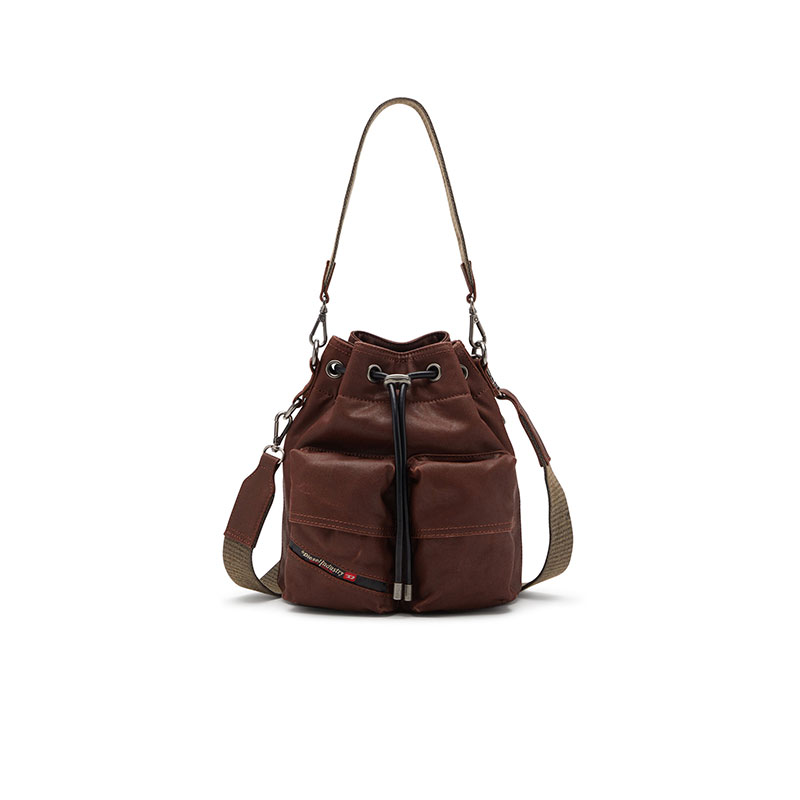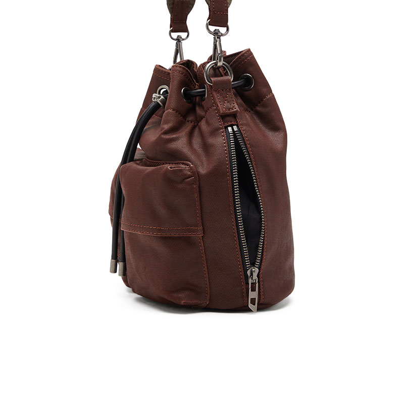 Unisex bucket-style bag with stretch fabric that offers greater versatility. Made of cotton, it features a removable and adjustable shoulder strap for convenience. The drawstring closure adds security. Details include multiple external flap pockets. The logo adds a distinctive touch to the design.