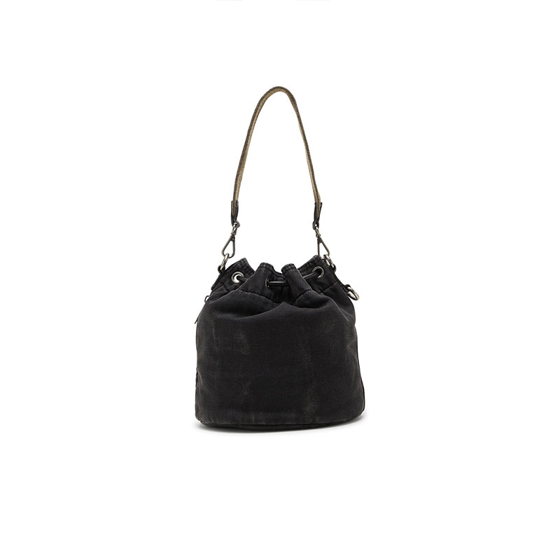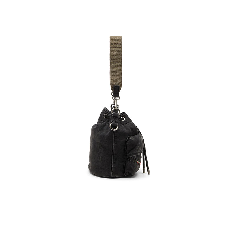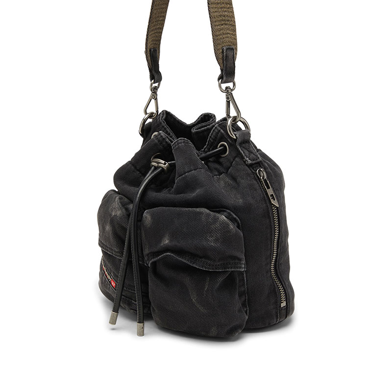 This unisex bucket bag is the ultimate utilitarian organiser. Crafted from Diesel's DNA fabric – denim – in a faded black wash, it’s kitted with easy-access flap pockets on the front, a zip pocket on the side and a convenient drawstring closure. The handle and shoulder strap can be detached, providing versatile carry options. Complete with the signature Diesel Industry flag.