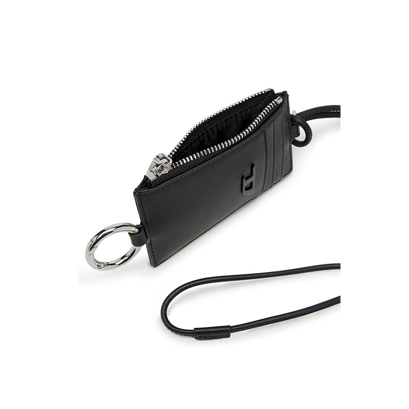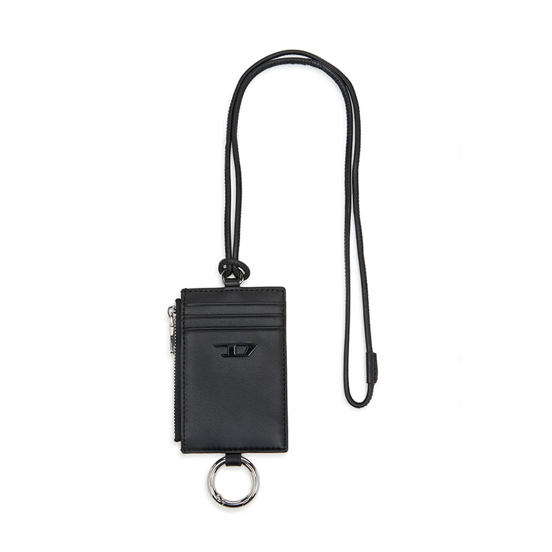 Men's black badge holder crafted from responsible leather. The versatile design features a zipped section, three card slots, and detachable split ring. It's subtly embellished with a tonal matte metal plaque cast in the shape of the iconic D logo.