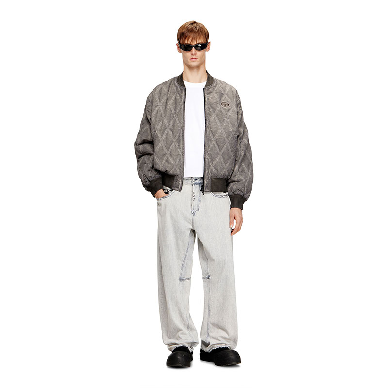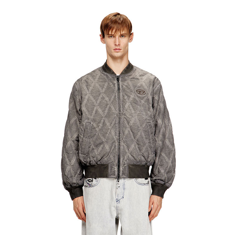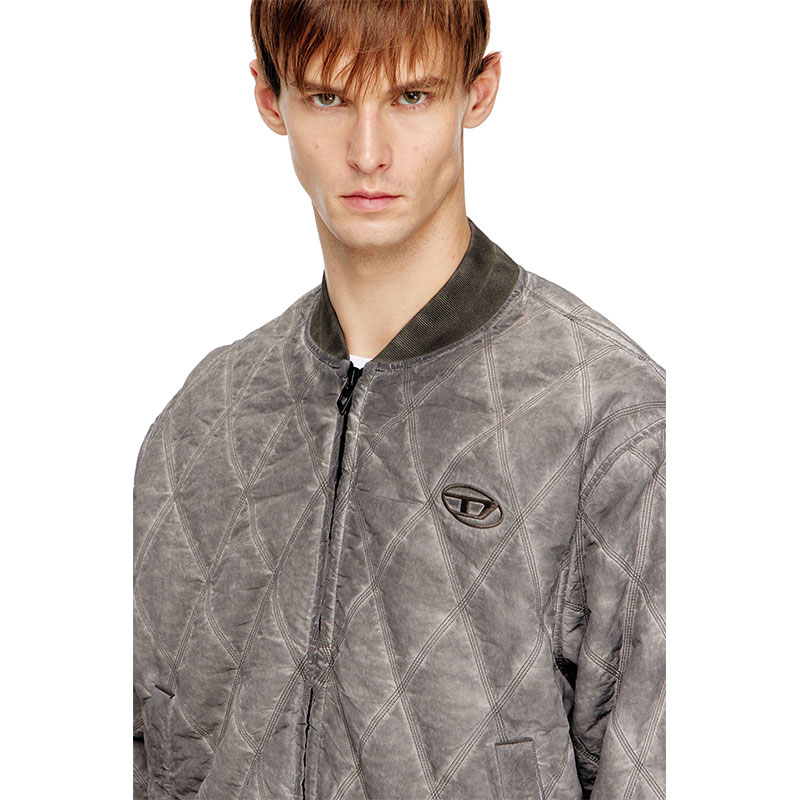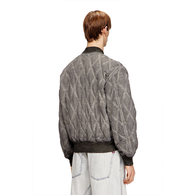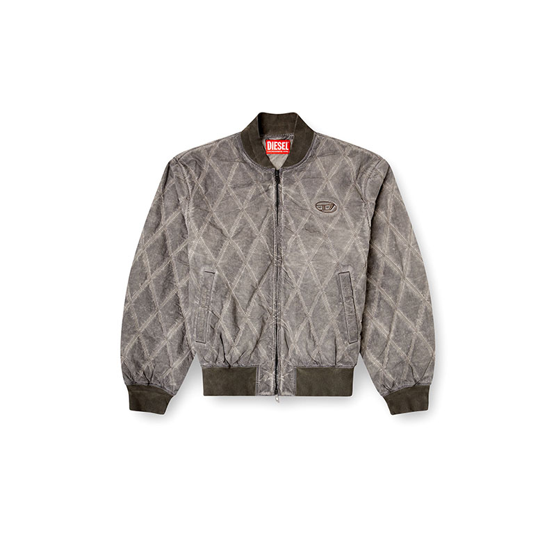 This men's padded bomber jacket is crafted from lightweight yet resilient Taslan, triple-stitched in argyle diamonds. A cold pigment dyeing process creates a chalky fade full of tonal variances, giving the quilting a three-dimensional edge. Classic ribbed trims and a chest logo patch complete the lived-in look.