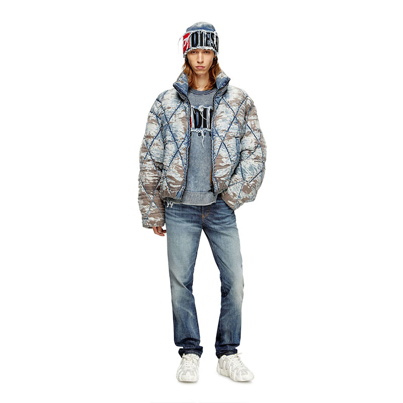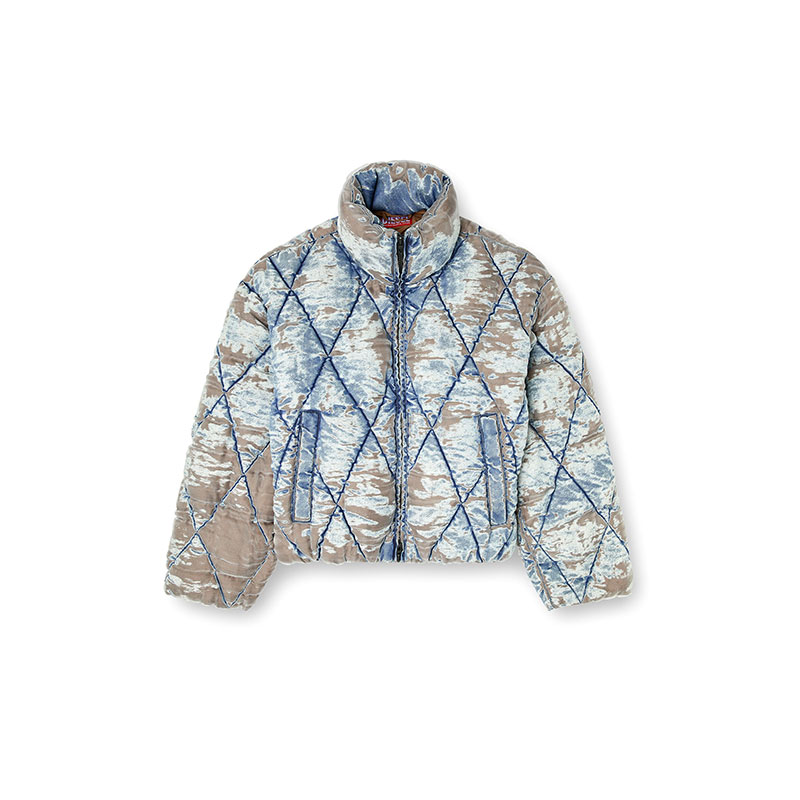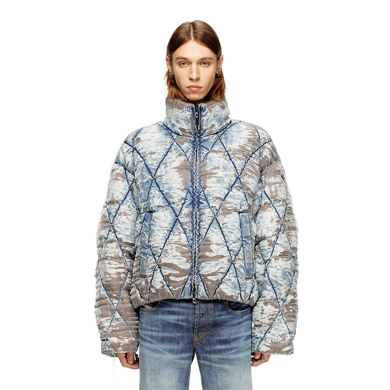 This men’s winter jacket is made from denim with argyle quilting and devoré distressing – the treatment creates areas of sheerness, revealing the garment’s coloured padding. The chunky collar and drawstring-adjustable cuffs and hem help trap heat.
