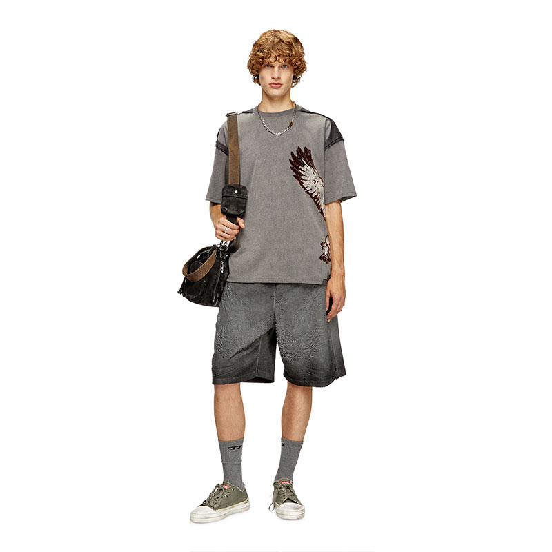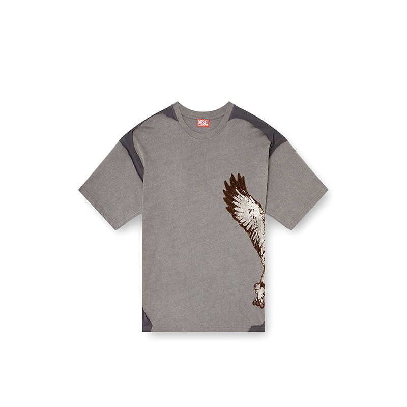 Built in a relaxed fit from grey organic cotton jersey, this men's tee is enriched with raw-cut overlays along the seams, curling up at the edges for a striking peeled effect. Flock-printed with hints of majestic eagle wings and branded with Oval D embroidery.