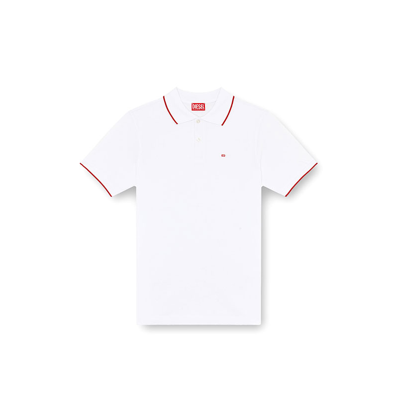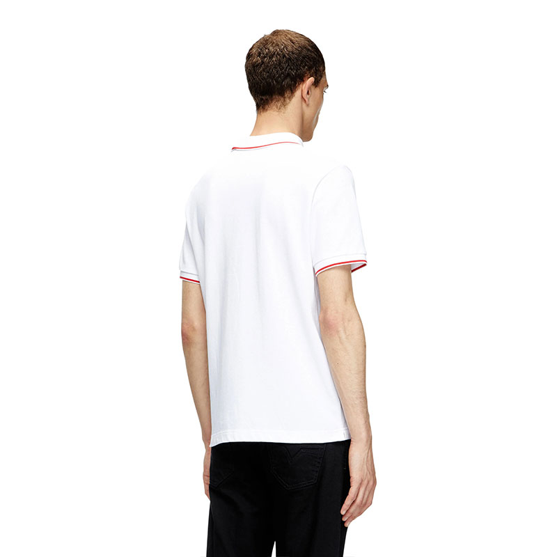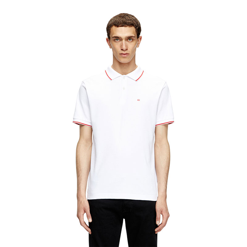 This men's polo shirt is styled for a slim fit. Cut from organic cotton piqué, it's accented with stripes on the collar and cuffs. Subtly embellished with a micro-embroidered Diesel logo on the left chest.