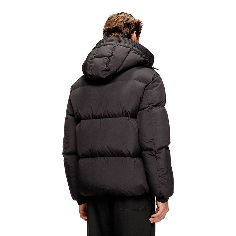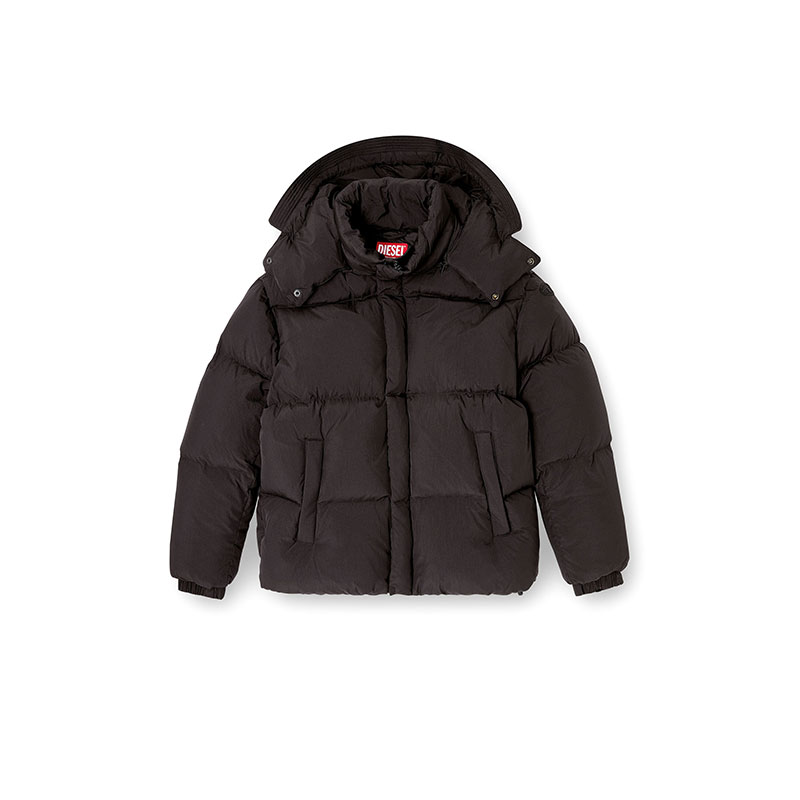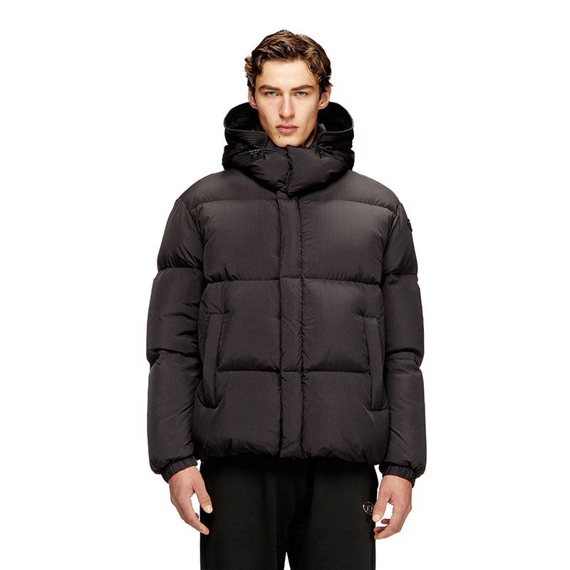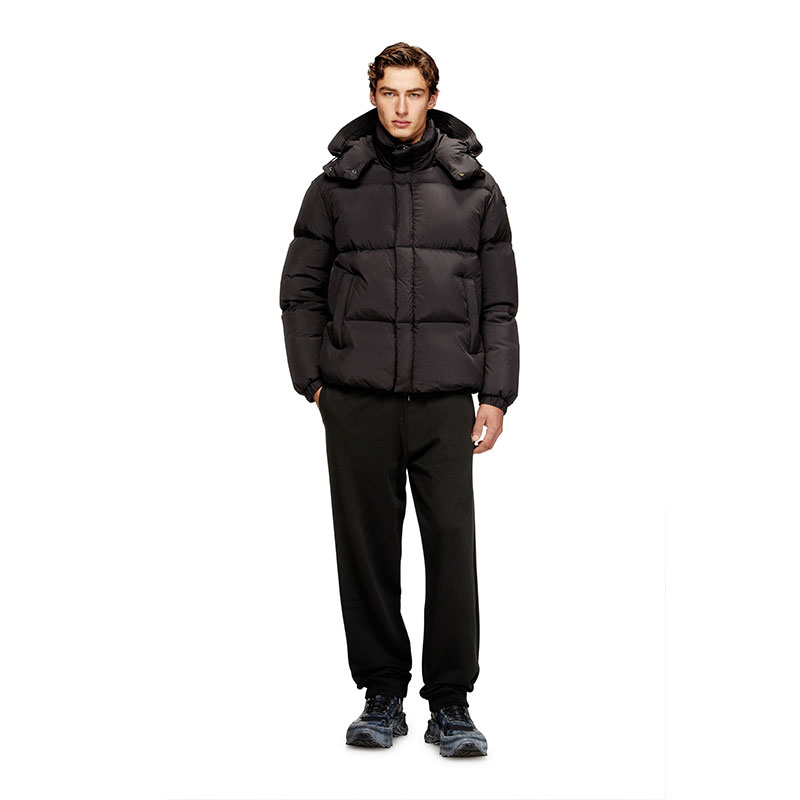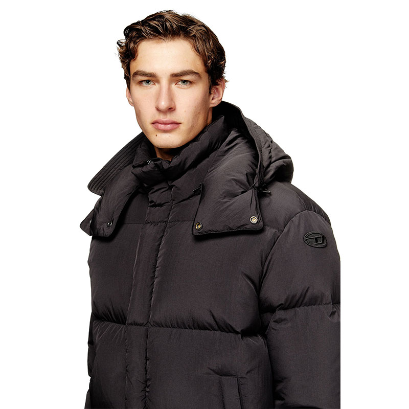 Made from Taslan with warm down insulation, this men’s quilted jacket is an excellent winter performer. The high-tech fabric – in 100% recycled nylon with a semi-matte, cotton-like hand – is ultra-lightweight yet resilient, treated with ViralOff® technology to resist microbes and preserve freshness. Featuring Diesel’s Oval D patch on the sleeve, the silhouette is equipped with a detachable hood, secure zip pockets and a drawstring to adjust the hem.