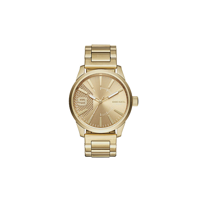 Watch with a machine-knurled gold-tone case and multi-link bracelet.