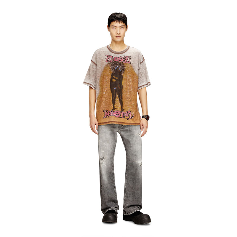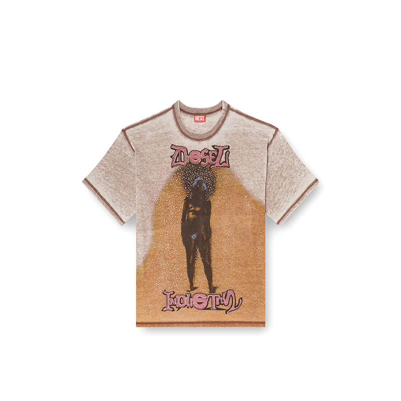 Short-sleeve T-shirt featuring a crew neck and a relaxed fit. Made from cotton-blend jersey, it has a burnout washed effect for a distinctive lived-in look. The design is enhanced by a sublimation print with studs on the front, while the Diesel logo stands out at the top. A small Diesel label is located on the left side seam.