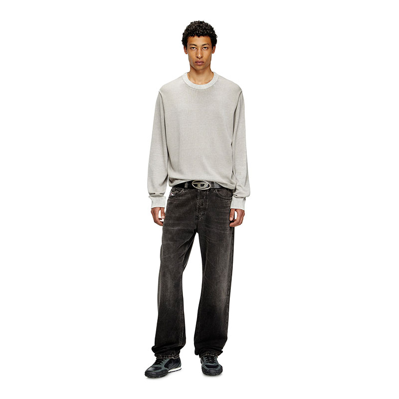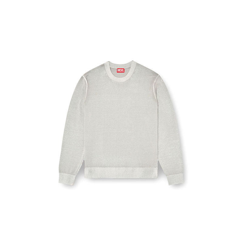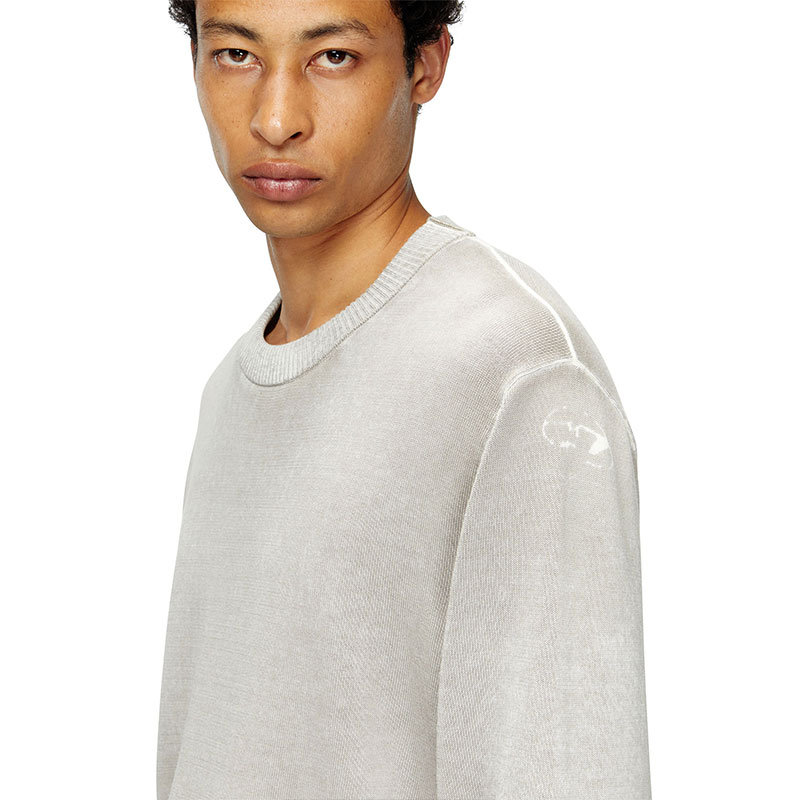 Men's crewneck pullover crafted from smooth gassed cotton yarn. Designed for a regular fit, the jumper has been specially printed on the inside, resulting in a softened, uneven colour. The effect of this technique is particularly visible on the ribbed trims and sleeves, where the tone is decidedly lighter.