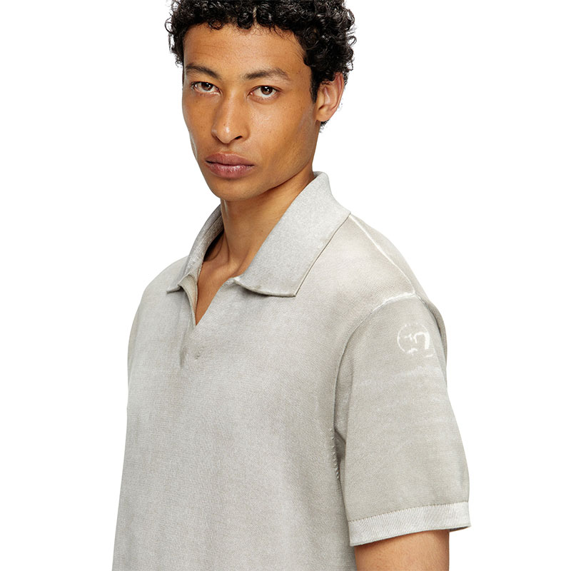 Men's knit polo in smooth gassed organic cotton. Featuring a relaxed open collar and short sleeves, this sweater has been specially printed on the inside, creating unique, irregular colouring on the outside. The effect of this technique is particularly visible at the ribbed trims, where the tone is decidedly lighter.
