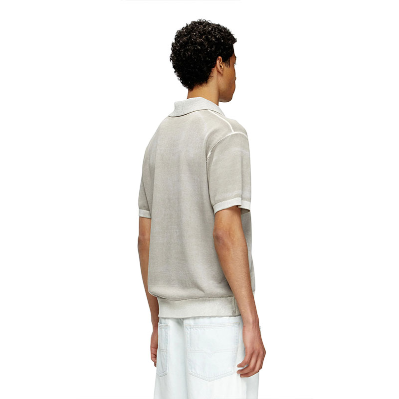 Men's knit polo in smooth gassed organic cotton. Featuring a relaxed open collar and short sleeves, this sweater has been specially printed on the inside, creating unique, irregular colouring on the outside. The effect of this technique is particularly visible at the ribbed trims, where the tone is decidedly lighter.