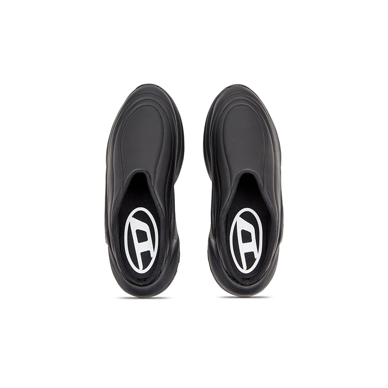 A sleek, monochrome take on a sculptural silhouette, these unisex mules reimagine the iconic S-D-RUNNER-X sneaker. The curve of the hand-treated matte upper, made from soft PU, is echoed in the meticulous stitching, as well as the sole – note the embossed Oval D branding wrapping beneath it.