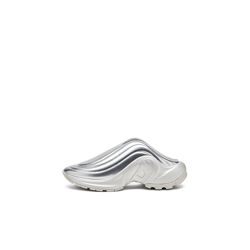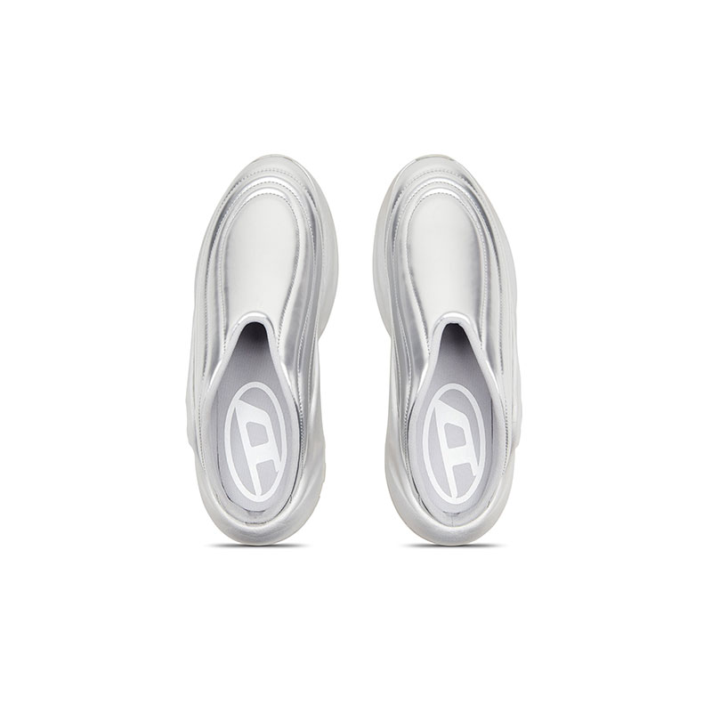 A mule iteration of the S-D-RUNNER-X sneaker, these genderless shoes combine a sculptural silhouette with a futuristic shine of metallic silver. The curve of the soft, slip-on upper is echoed in the meticulous stitching, complemented by an exaggerated sole that’s embossed with a folded-effect Oval D logo.