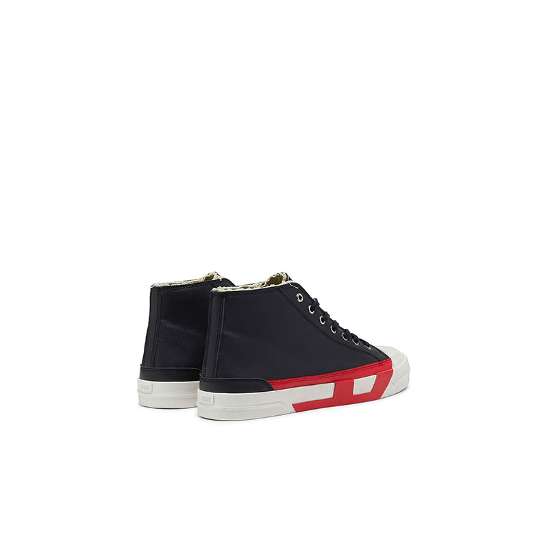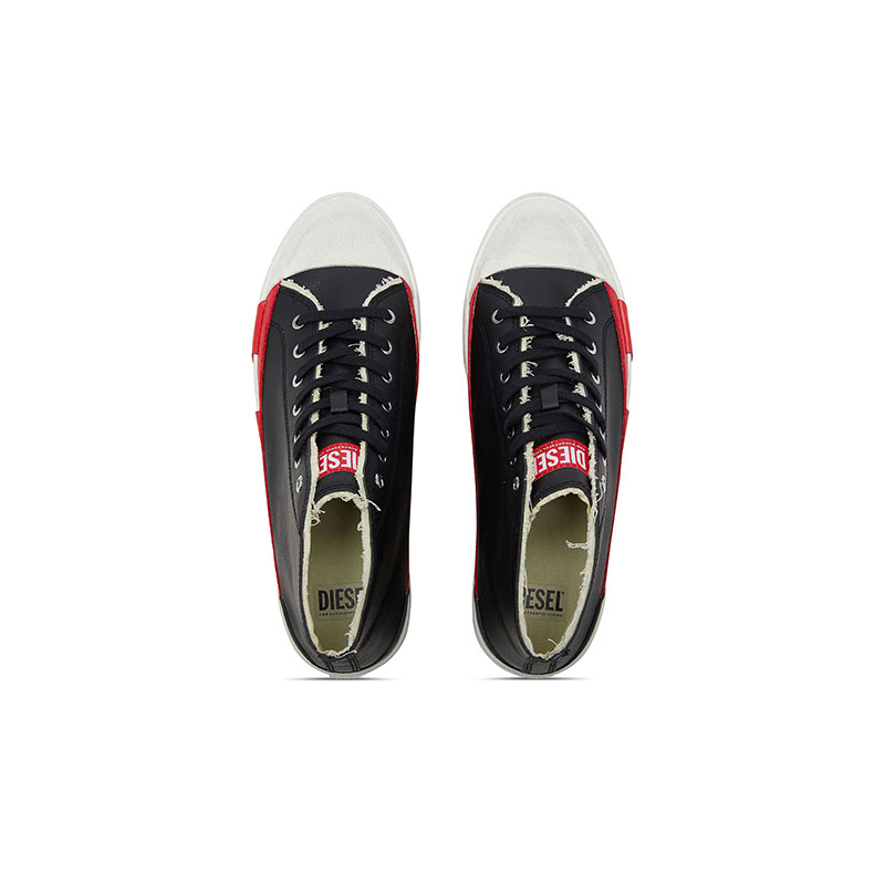 These high-top sneakers feature raw edges and a distinctive D logo displayed on the side, crafted with contrasting inserts on the upper and sole. Branding includes a woven label with the Diesel Biscotto logo on the tongue, and a small rubberized Diesel branding patch on the back of the heel. The rubber sole is subtly textured.