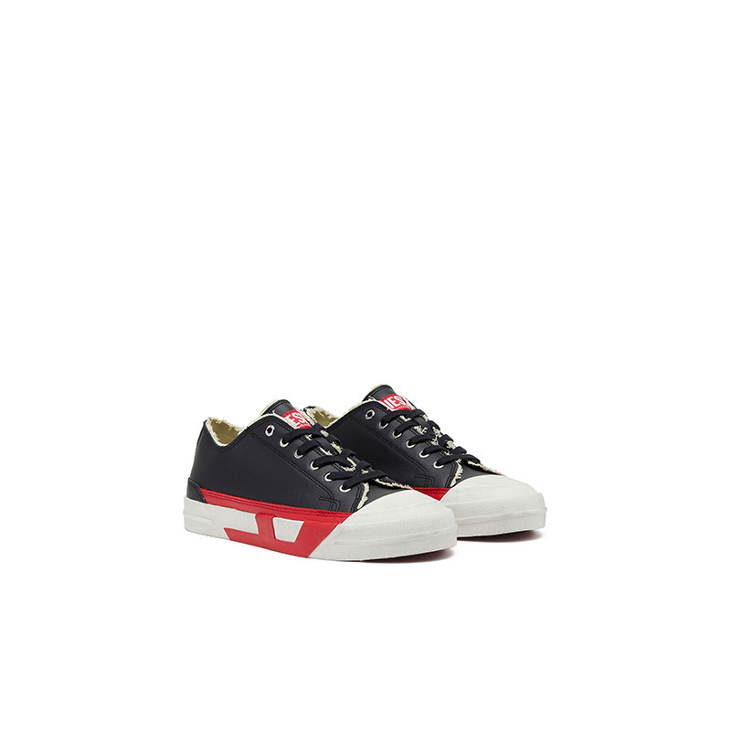 Vulcanized sneakers featuring a low and sturdy upper with raw-cut edges and a grained texture. They have the logo on the tongue and a lace-up closure with metallic eyelets. The slightly elevated midsole gives a bold look, also thanks to the contrasting inserts that outline the letter D.