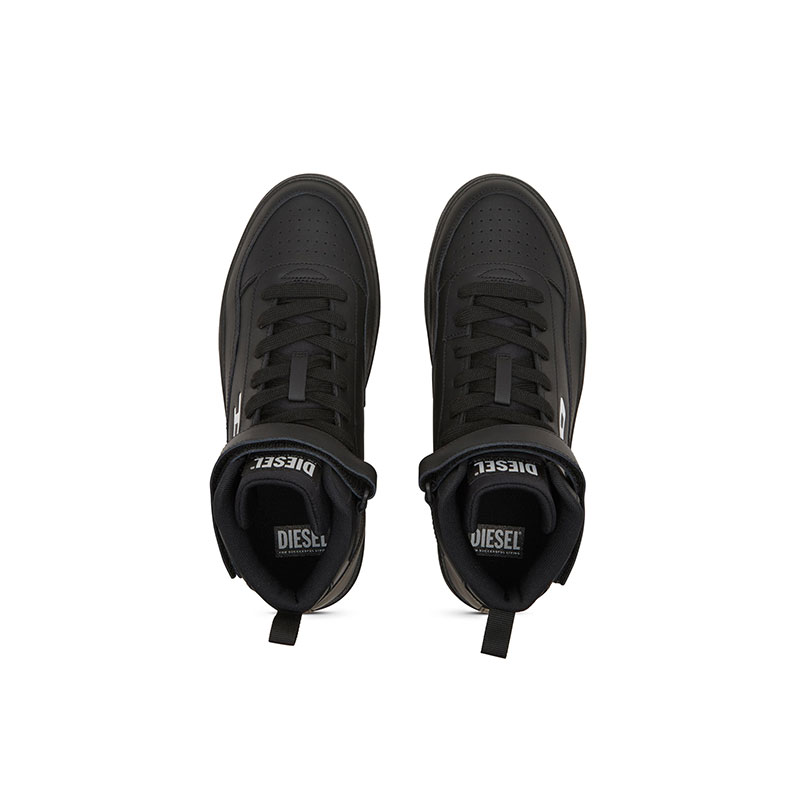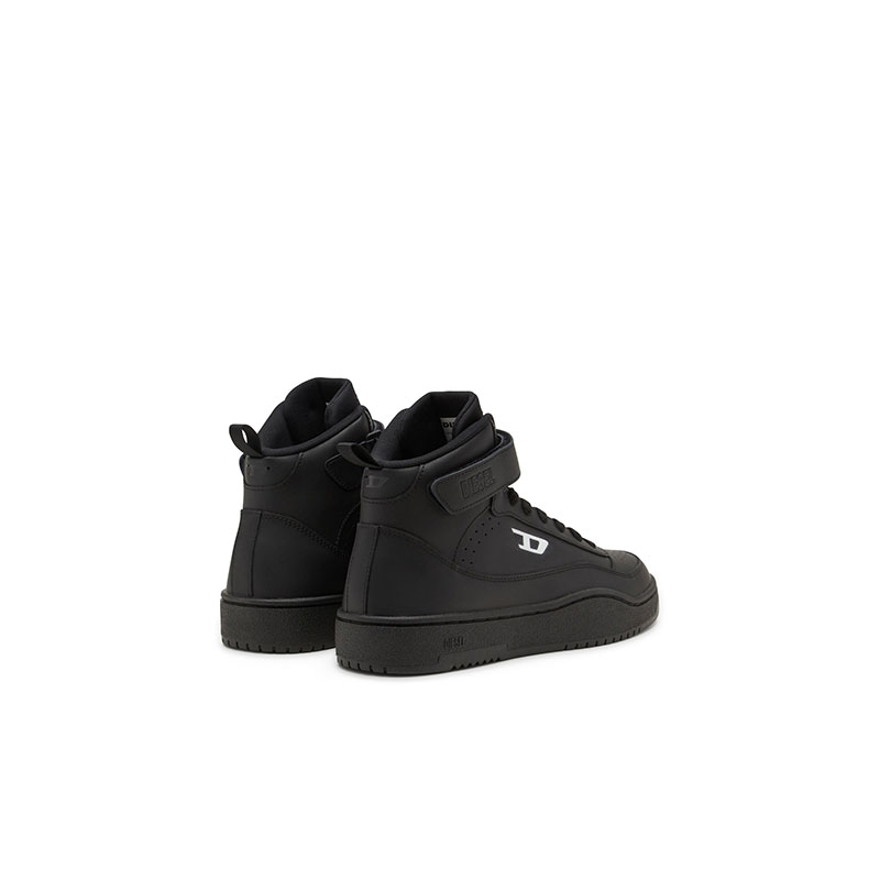 Men's mid top sneaker made of soft calfskin leather with avant garde details. The nineties inspired upper has a classic silhouette, with contrasting Diesel logos on the tongue at the side. A tonal Diesel logo also features on the velcro ankle strap. The chunky rubber sole has a custom tread.