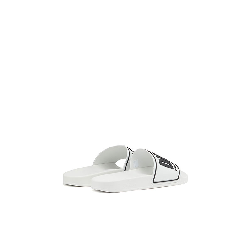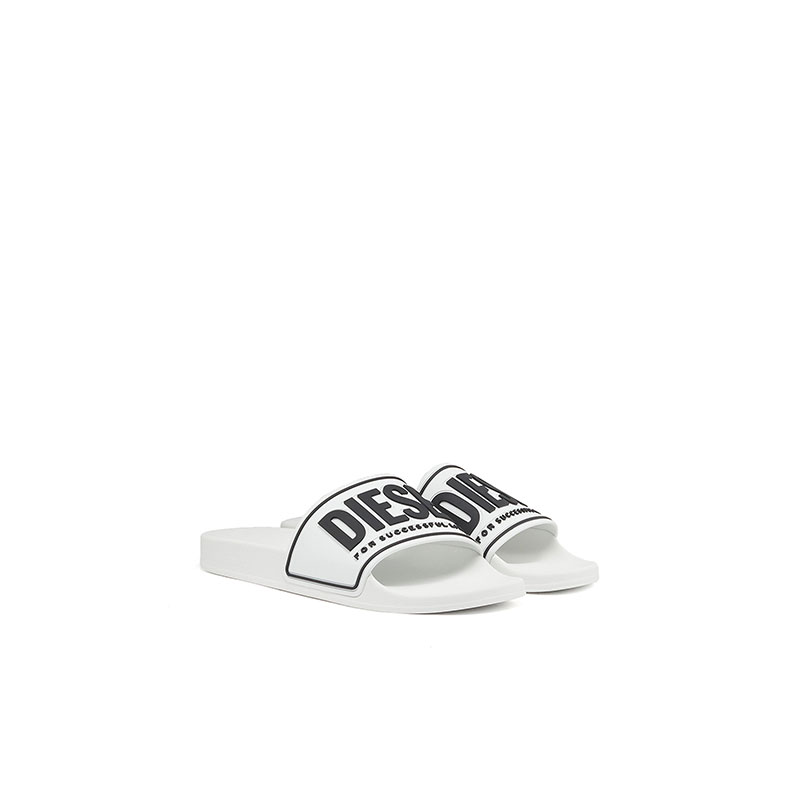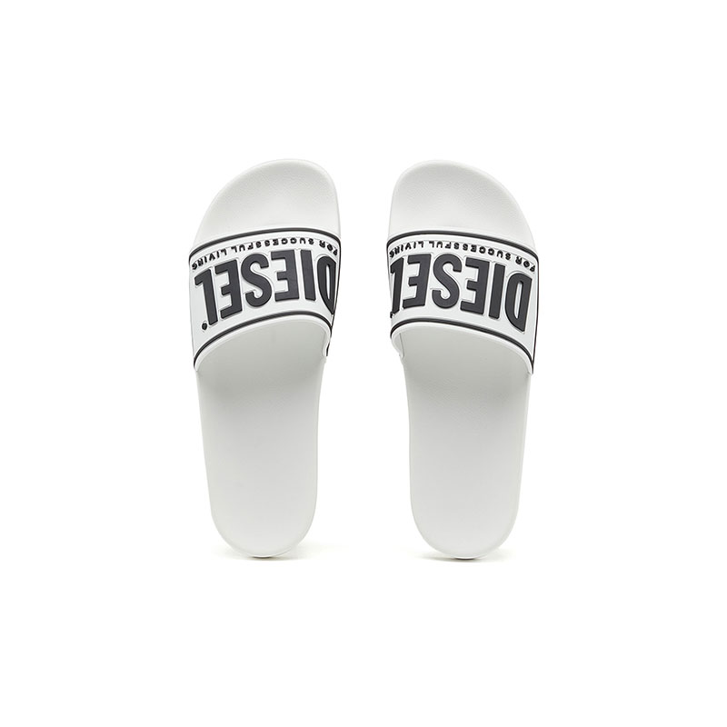 These pool slides are styled with moulded footbeds and gripped logo soles. The wide upper band is branded with a 3D Diesel For Successful Living logo and trim.