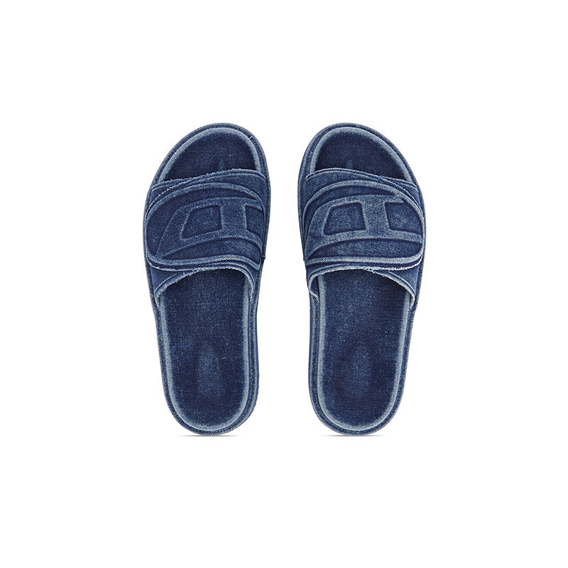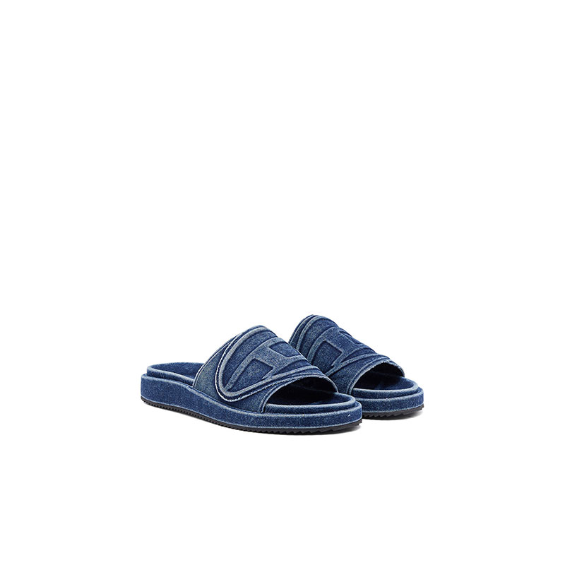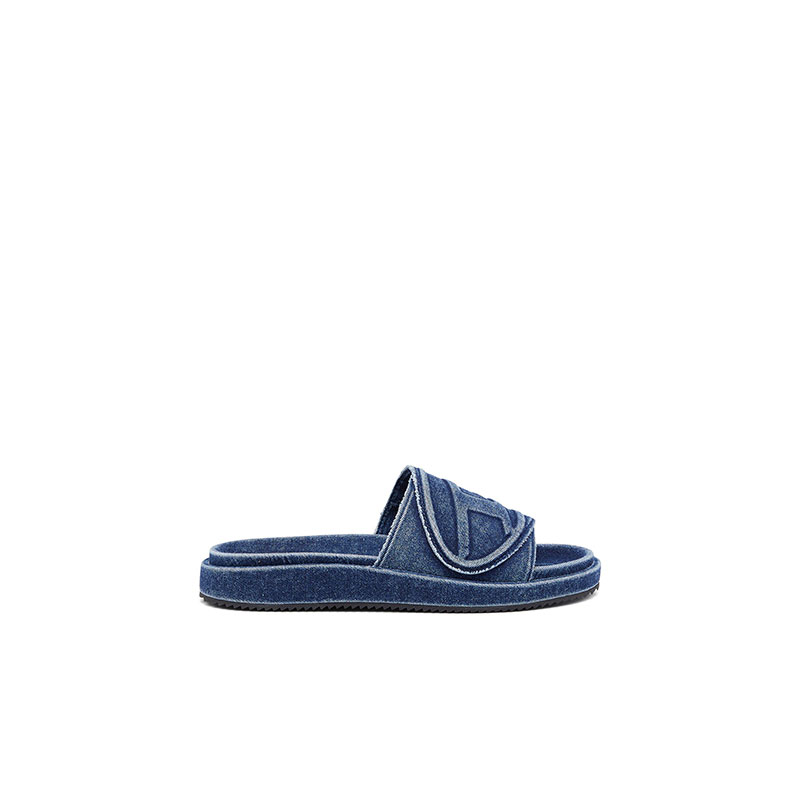 These slides are fully covered in Diesel denim, and feature an embossed Oval D logo on the strap and an ergonomic footbed with a gripped rubber sole.
