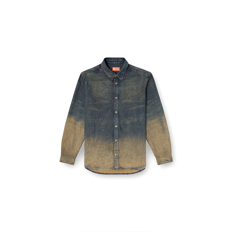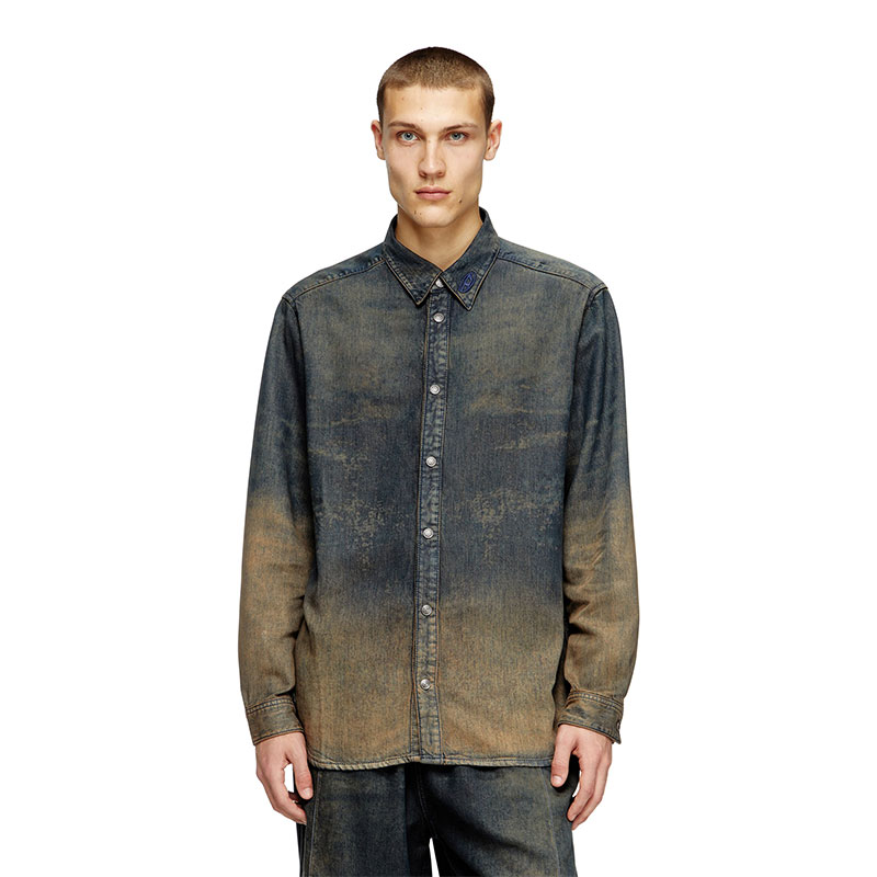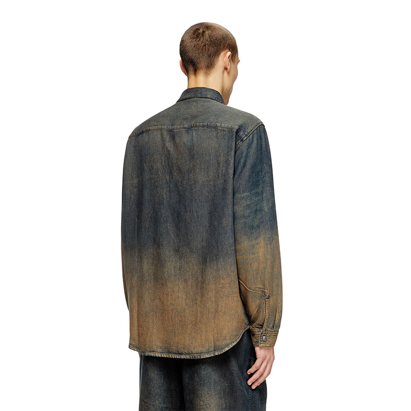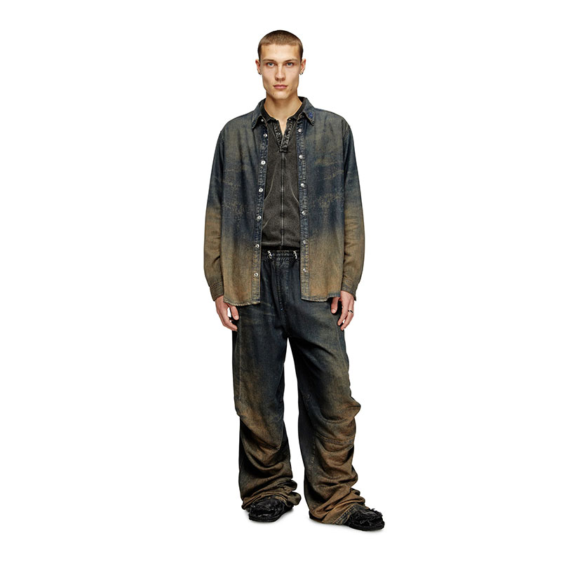 Crafted from dark blue lightweight Tencel Lyocell denim with a fluid texture. The dark blue wash is treated with spray and laser techniques to create a dégradé finish on the hem, enhanced by dirt effects in sandy tones.