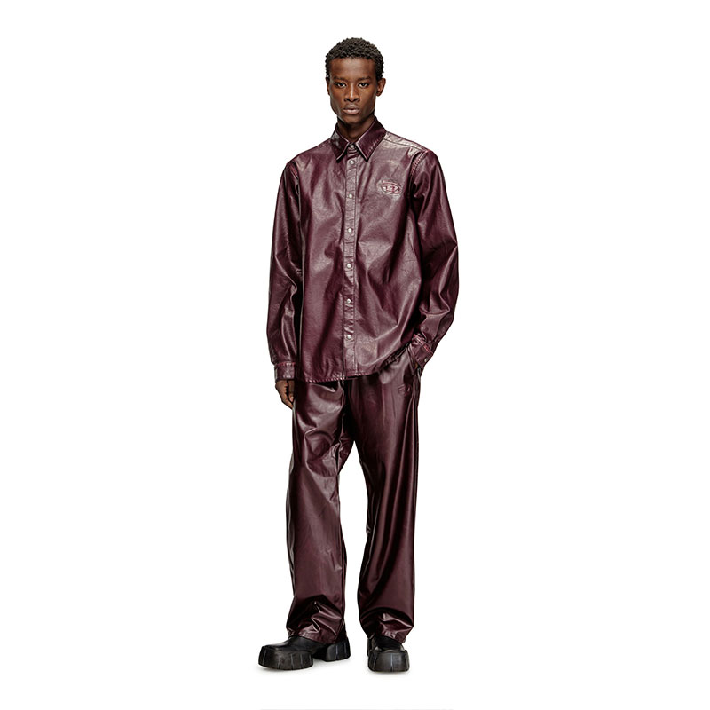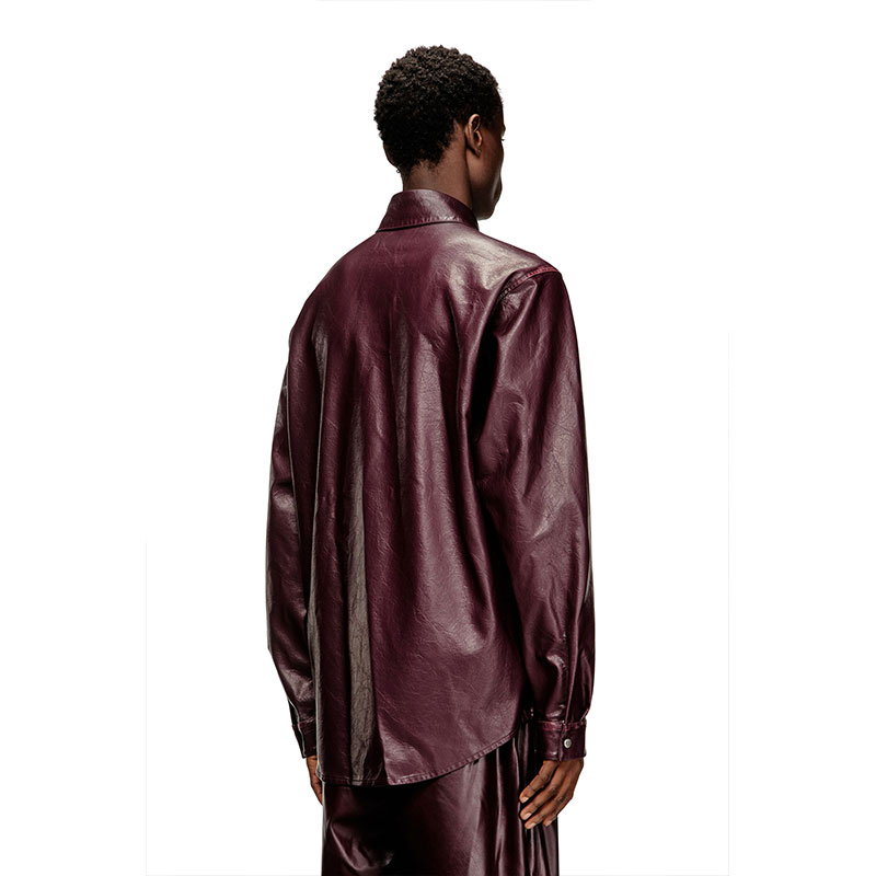 Men's regular fit shirt, crafted from burgundy coated fabric, offering a unique, smooth texture that feels a bit like leather. The clean, essential construction is enriched with branded press buttons at the front.