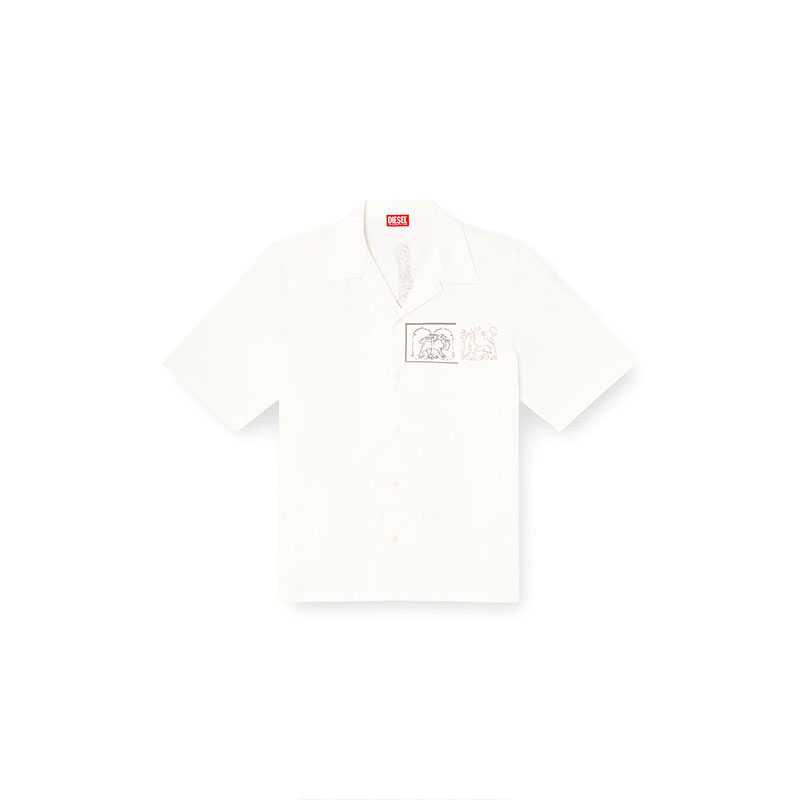 This men's shirt is built in a regular bowling silhouette from organic cotton jersey. The chest is printed with a woodland animal illustration, while the back features a medieval-inspired graphic of a sword. D logo embroidery hallmarks the sleeve.