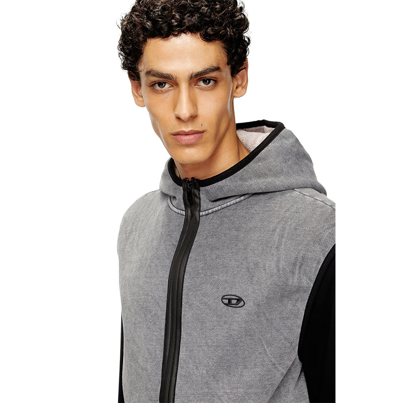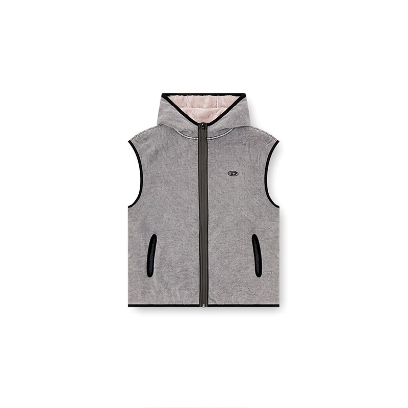 Sleeveless hoodie with a comfortable fit, thanks to the stretchy component. Made of indigo fleece fabric and with a teddy interior, it underwent an acid washed treatment for a worn effect. It features durable lycra edges on the front pockets and the front closure is a heat-sealed zip. The logo is double: on the front left side, there is a small thermo-applied embroidery while on the back there's a large Oval D logo in denim.
