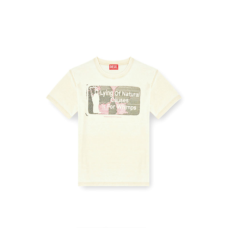 Part of an artistic collab, this men's T-shirt is printed with artwork featuring a playful spin on the slogan 'Dying of natural causes is for wimps' – note the silhouette of a grim reaper wielding a scythe. It's cut from jersey to a regular fit and finished with a burnout wash for a lived-in look.