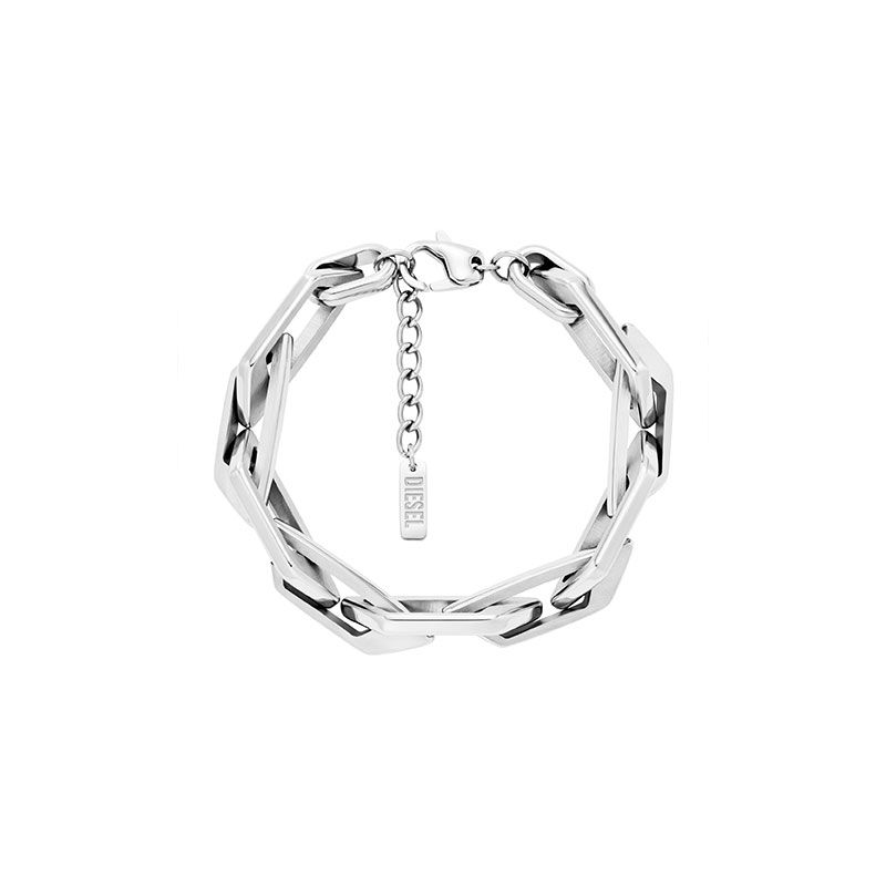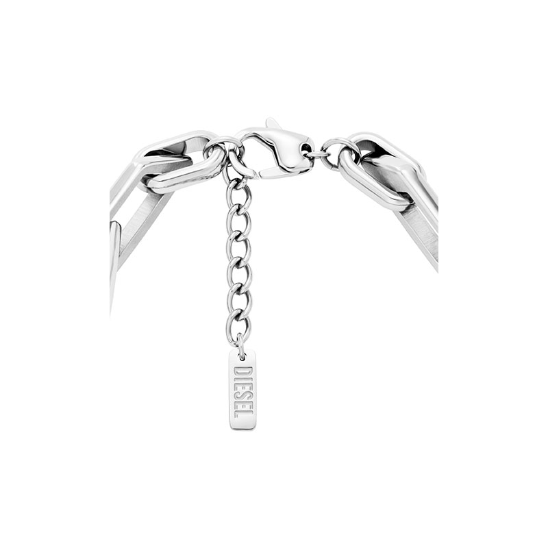 Diesel's stainless steel chain bracelet featuring the iconic D logo is a unique addition to any collection. The silver finish offers a classic feel, while the lobster clasp ensures a secure fit. This bracelet is designed with Diesel's signature edge, making it a standout accessory for everyday wear.