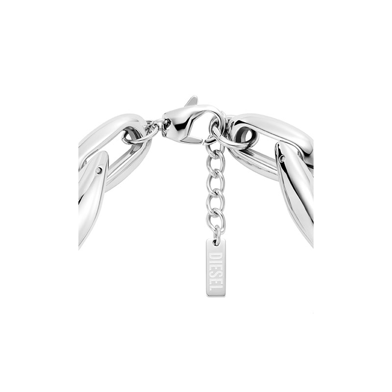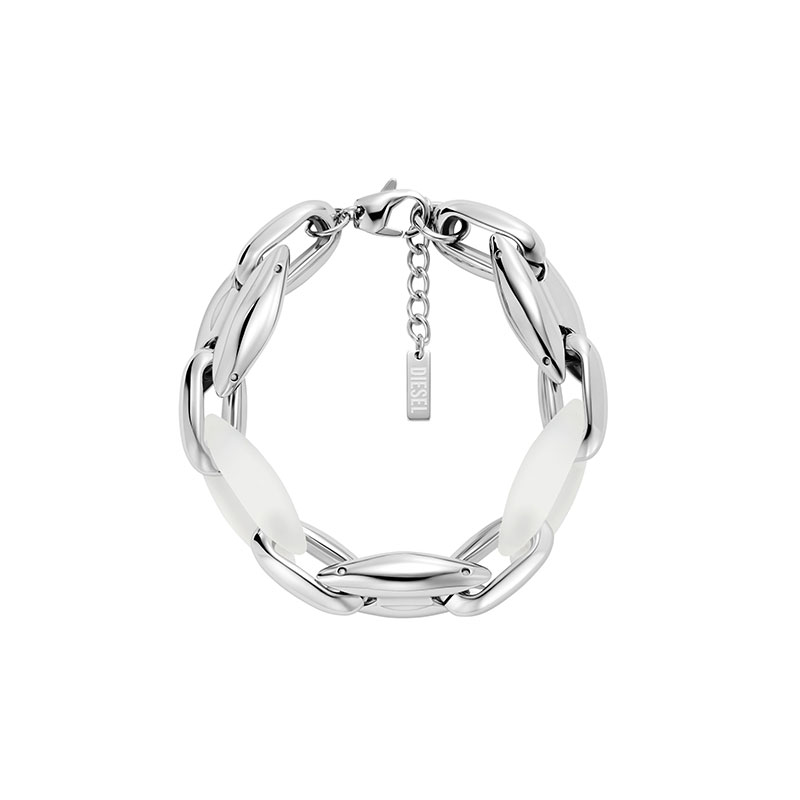 Inspired by the Metamorph collection, this Diesel chain bracelet features stainless steel and silicone links in the center with a stainless steel chain and lobster clasp closure. Bold, modern, statement-making.