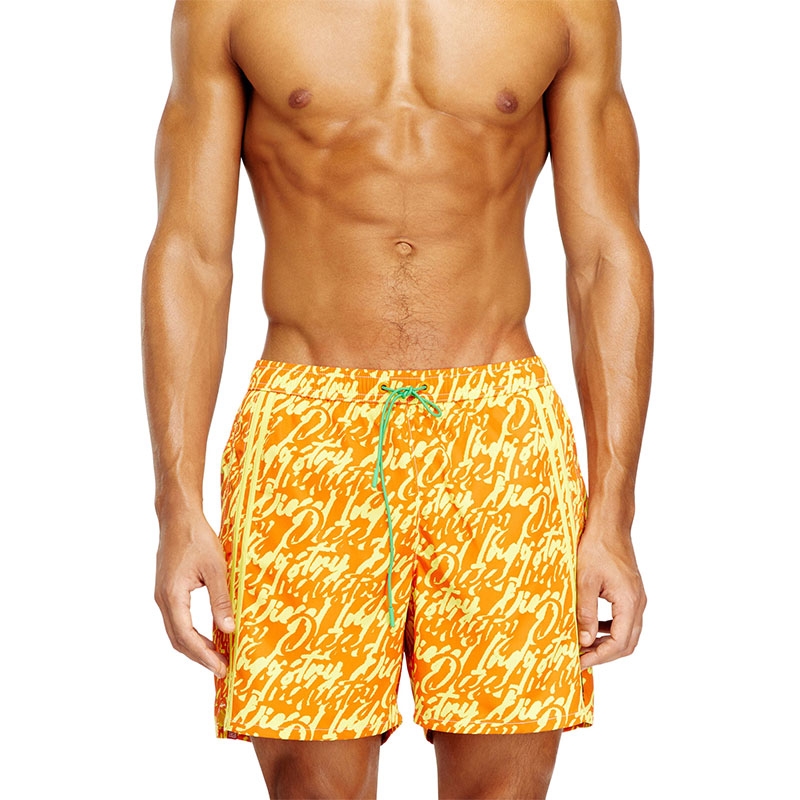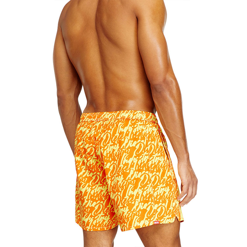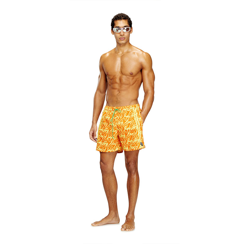 Medium-length swimming trunks made of recycled nylon with mesh pocket lining. The shorts feature an all-over graphic print that interprets the Diesel logo in fluid lettering. Complete with a contrasting drawcord with branded rubber tips, a signature rubber eyelet at the center front, and two solid side stripes for a sporty twist. A DSL patch is embroidered at the front left hem.