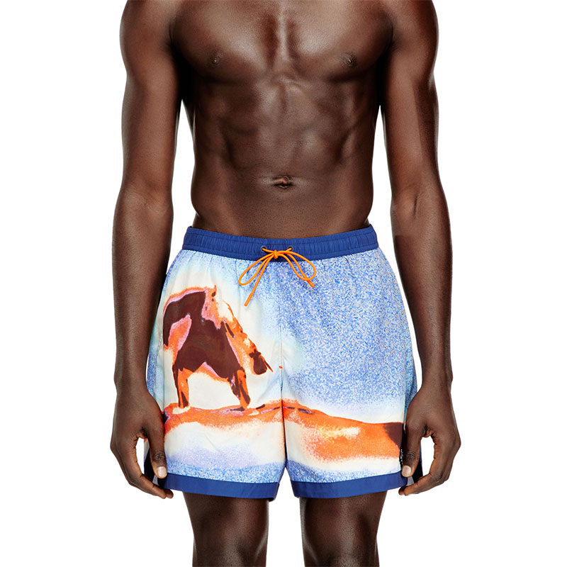 These medium-length men's beach shorts are made from recycled nylon with mesh-lined pockets. The swim shorts feature an all-over surfboard print, contrast waistband and hem, and a drawcord with branded rubber tips. Complete with a DSL logo embroidery patch at the front left hem and a rubber logo eyelet at the front.