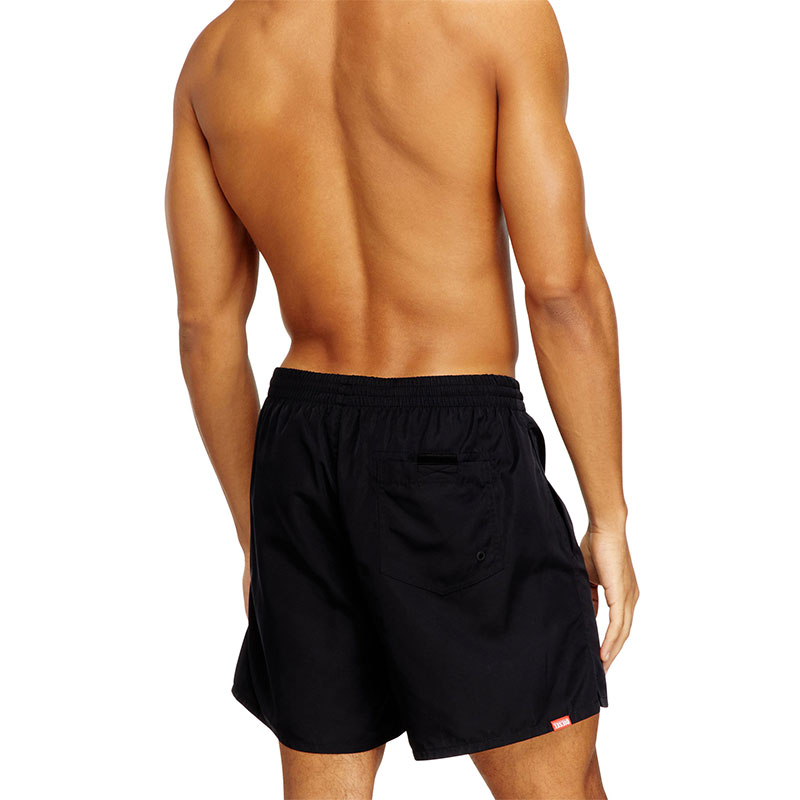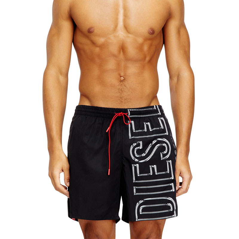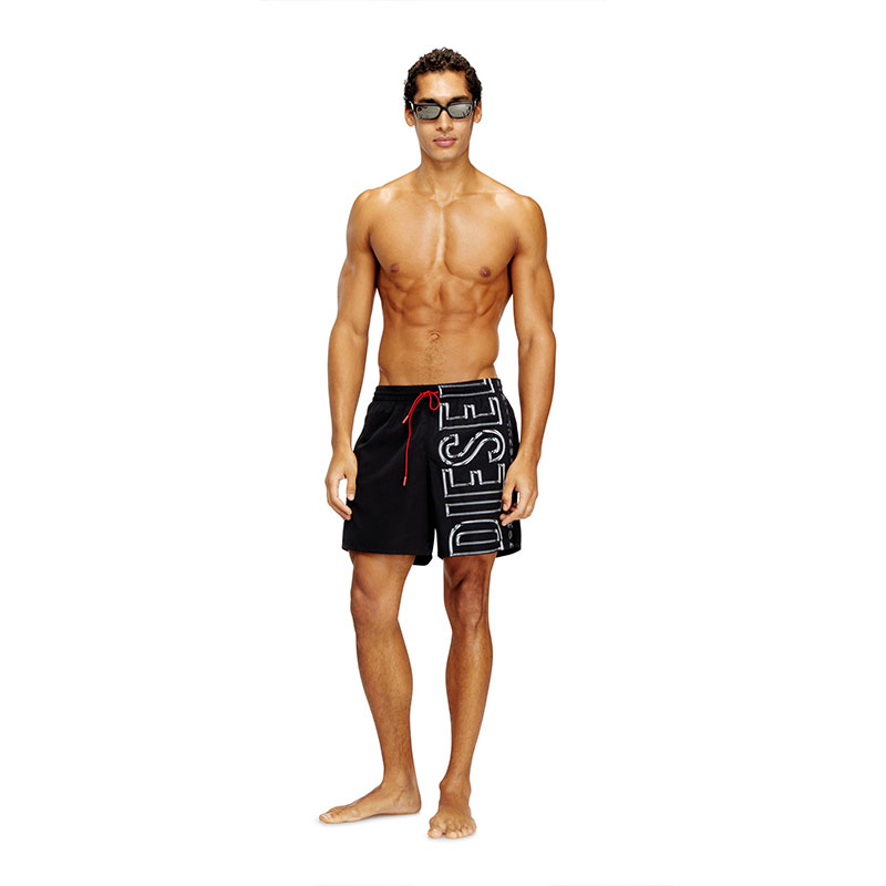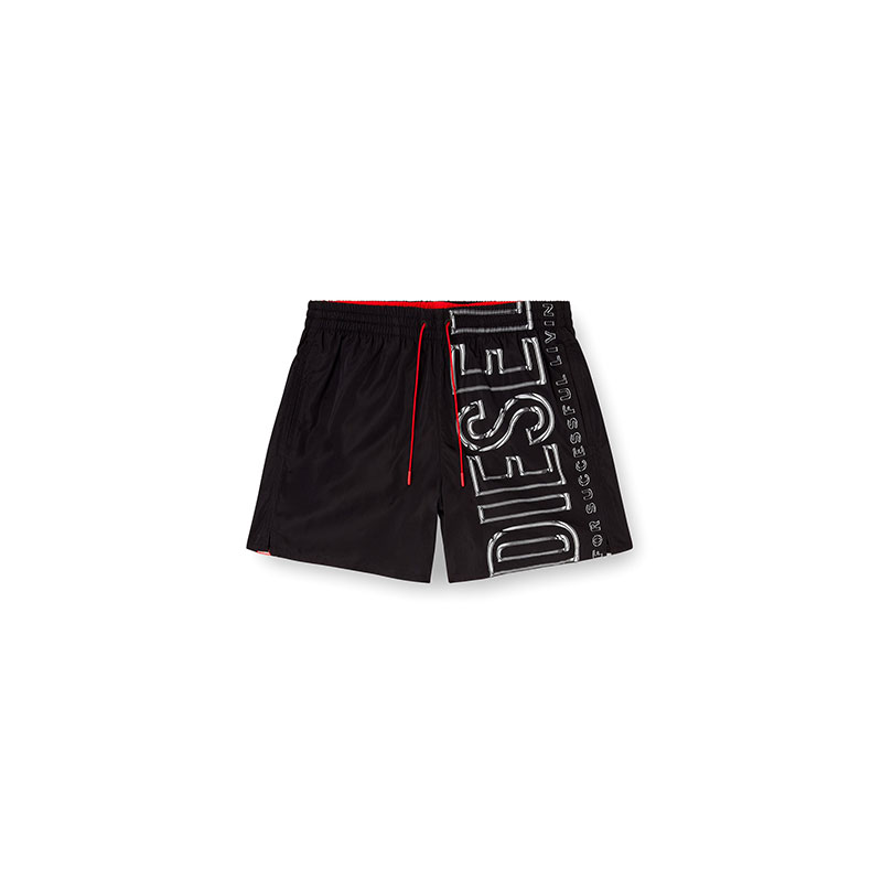 Beachwear boxer shorts made from recycled polyester fabric with a mesh lining and a comfortable elastic waistband, featuring a contrasting drawcord with branded rubber tips. Fitted with side pockets and a back flap pocket, the style is characterised by a striking vertical logo print with a fluid look.