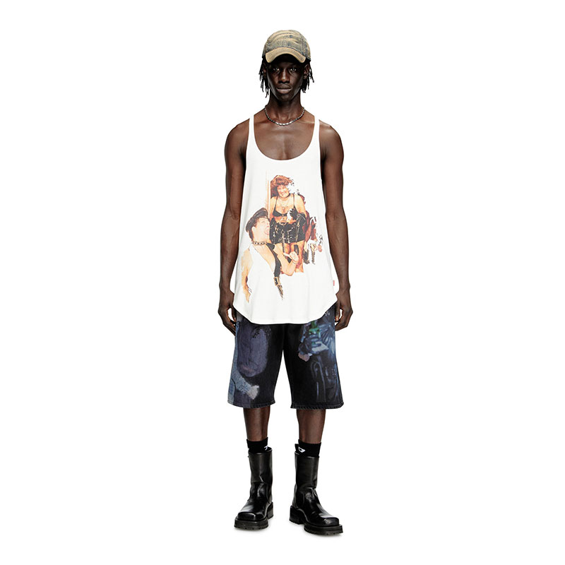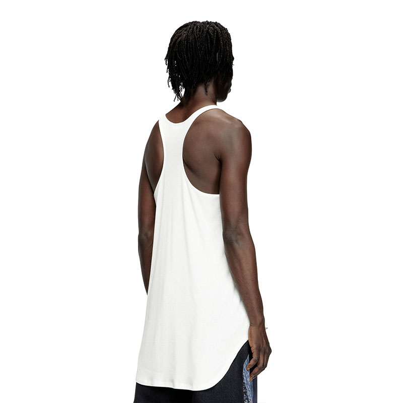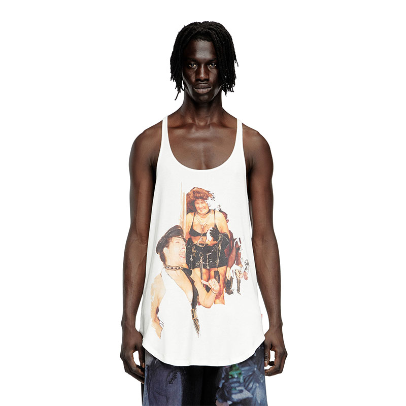 In time for Pride, Diesel once again joins forces with the Tom of Finland Foundation to celebrate the LGBTQIA+ community and reaffirm the importance of freedom of expression and sexuality. Part of the capsule, this long tank top is cut from lightweight ribbed jersey in a relaxed silhouette with a deep scoop neck and rounded hem. A printed depiction of work selected from the foundation's art collection brings this genderless design to life. Take a closer look at the back to spot the herringbone tape featuring a message from Tom of Finland himself.