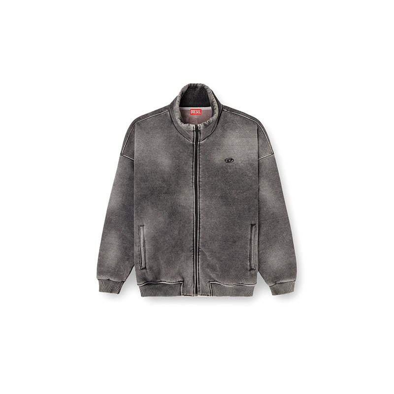 This men’s full-zip jacket nods to Diesel’s denim DNA. The indigo-dyed sweatshirt outer is faded to mimic stonewashed denim and bonded to teddy fleece, ensuring cosy insulation. The silhouette has a funnel neck and comfortable ribbed trims. Finished with an embroidered Oval D logo on the chest.