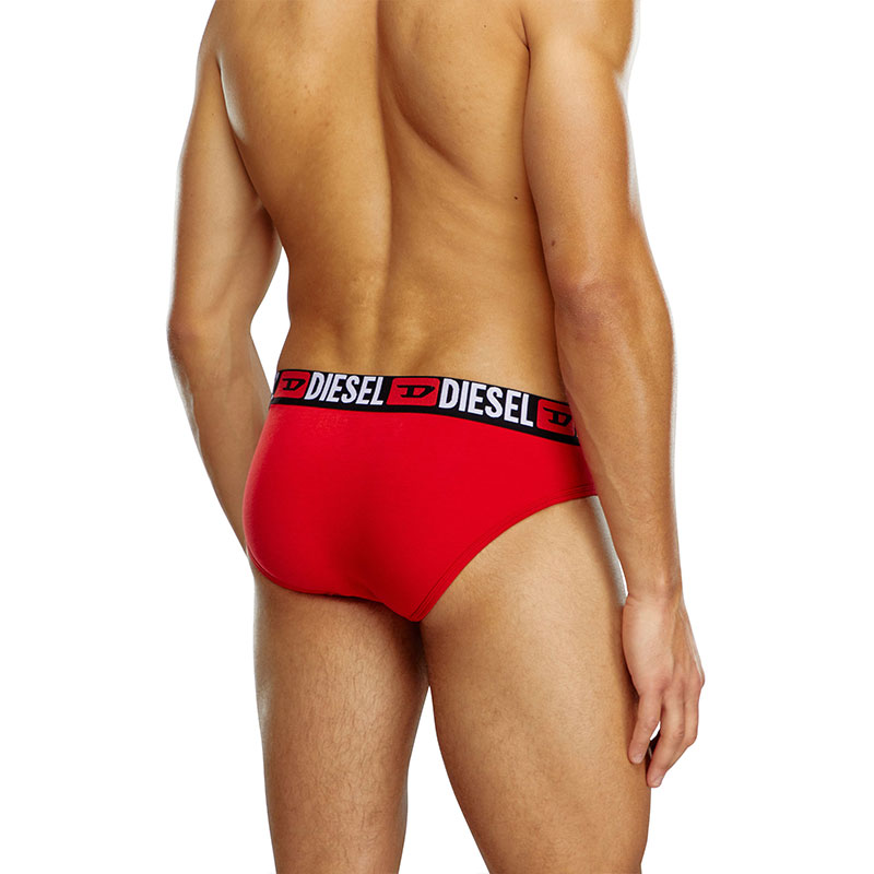 Three-pack of briefs in stretch cotton. The soft jacquard waistband is woven all-over with the Diesel logo and Denim Division D emblem.